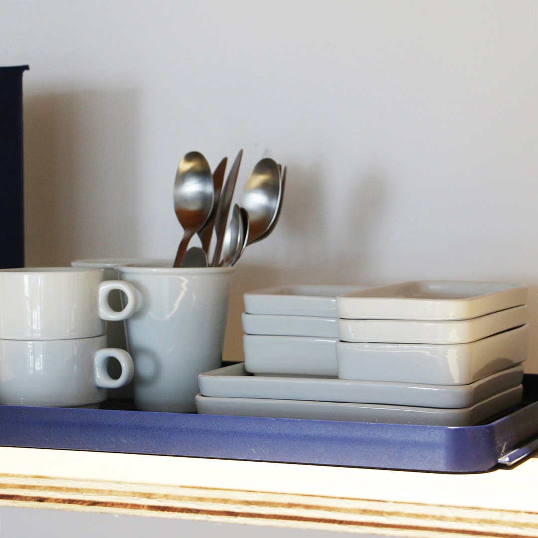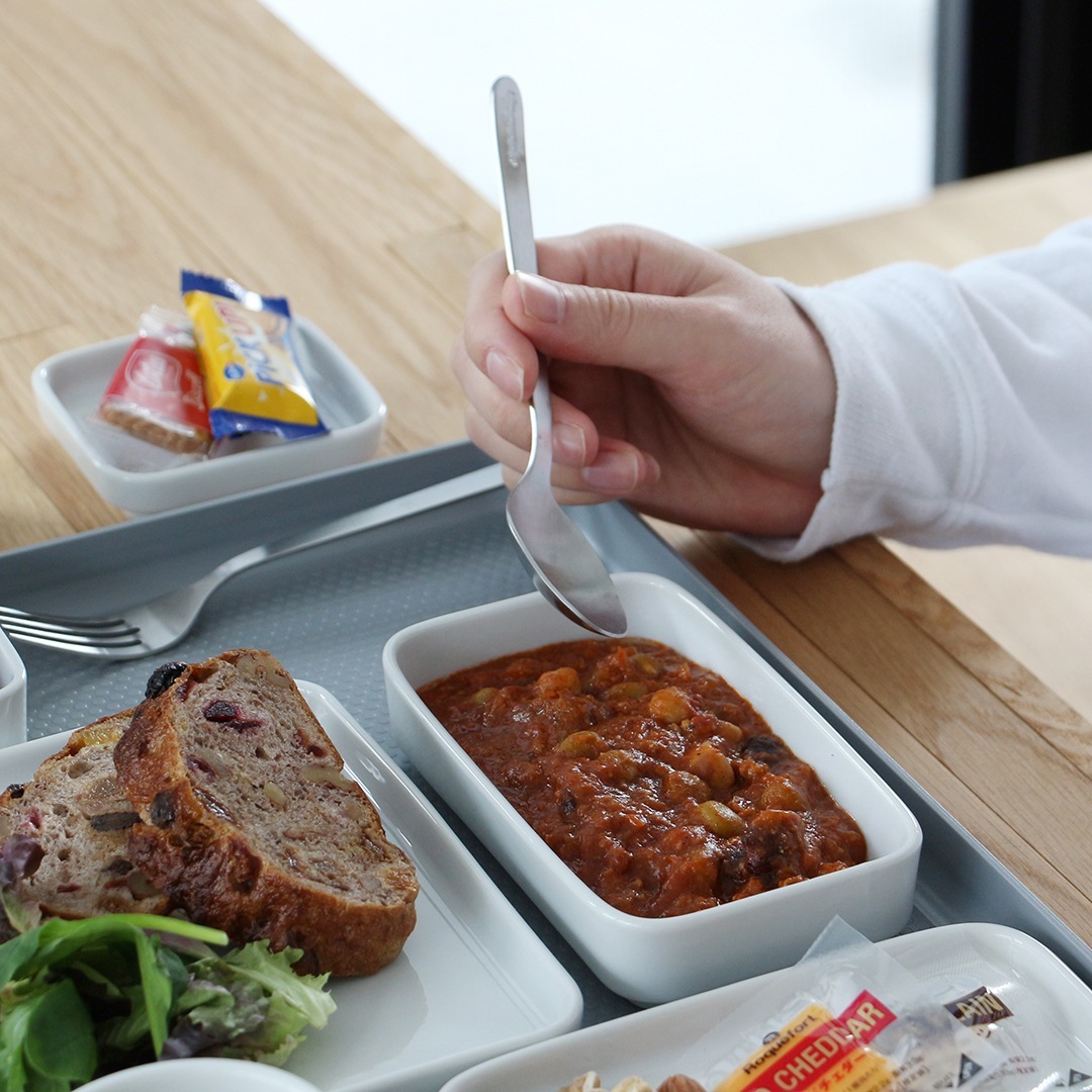 スクエア型でスタッキングもできるので、場所をとらずすっきりと収納できます。実際に機内で使われていたこともあり、限られた座席スペースでもゆっくりと食事時間を取れるように実用性を考慮された仕様になっています。