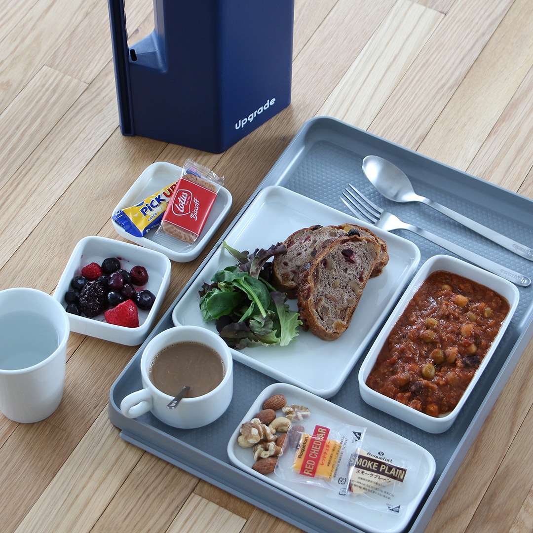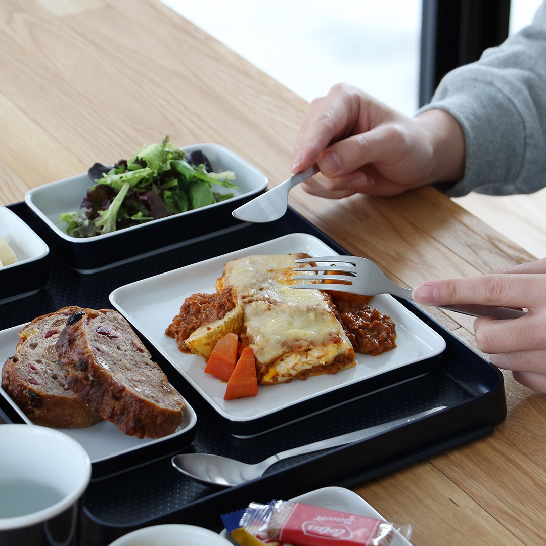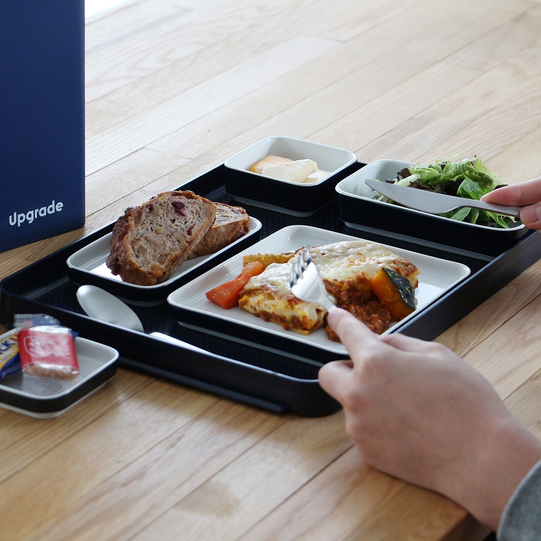 スクエア型でスタッキングもできるので、場所をとらずすっきりと収納できます。実際に機内で使われていたこともあり、限られた座席スペースでもゆっくりと食事時間を取れるように実用性を考慮された仕様になっています。