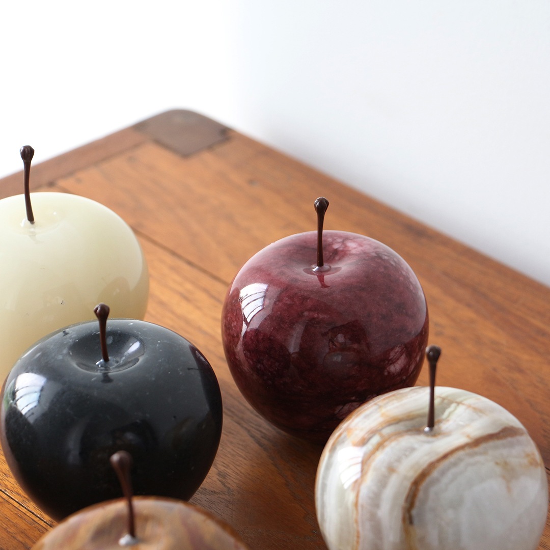 天然のマーブルストーン(大理石)を削り出して作られたアップルオブジェ。ヴィンテージでも見られるマーブルストーンを使用した削り出しオブジェを再現したデザイン。デスク周り、棚へのディスプレイやペーパーウェイトとしてお使いいただけます。