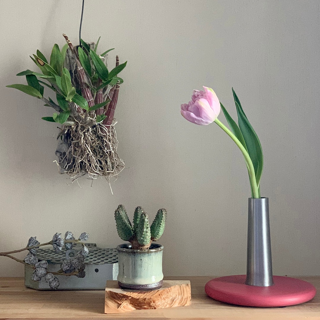 通常の筒状フラワーベースに比べ水の使用量も少なく済み、一輪だけでもシンプルでいて飽きのこないデザイン。活けるために茎や枝葉を剪定する時間もまた楽しく過ごすことができそうです。