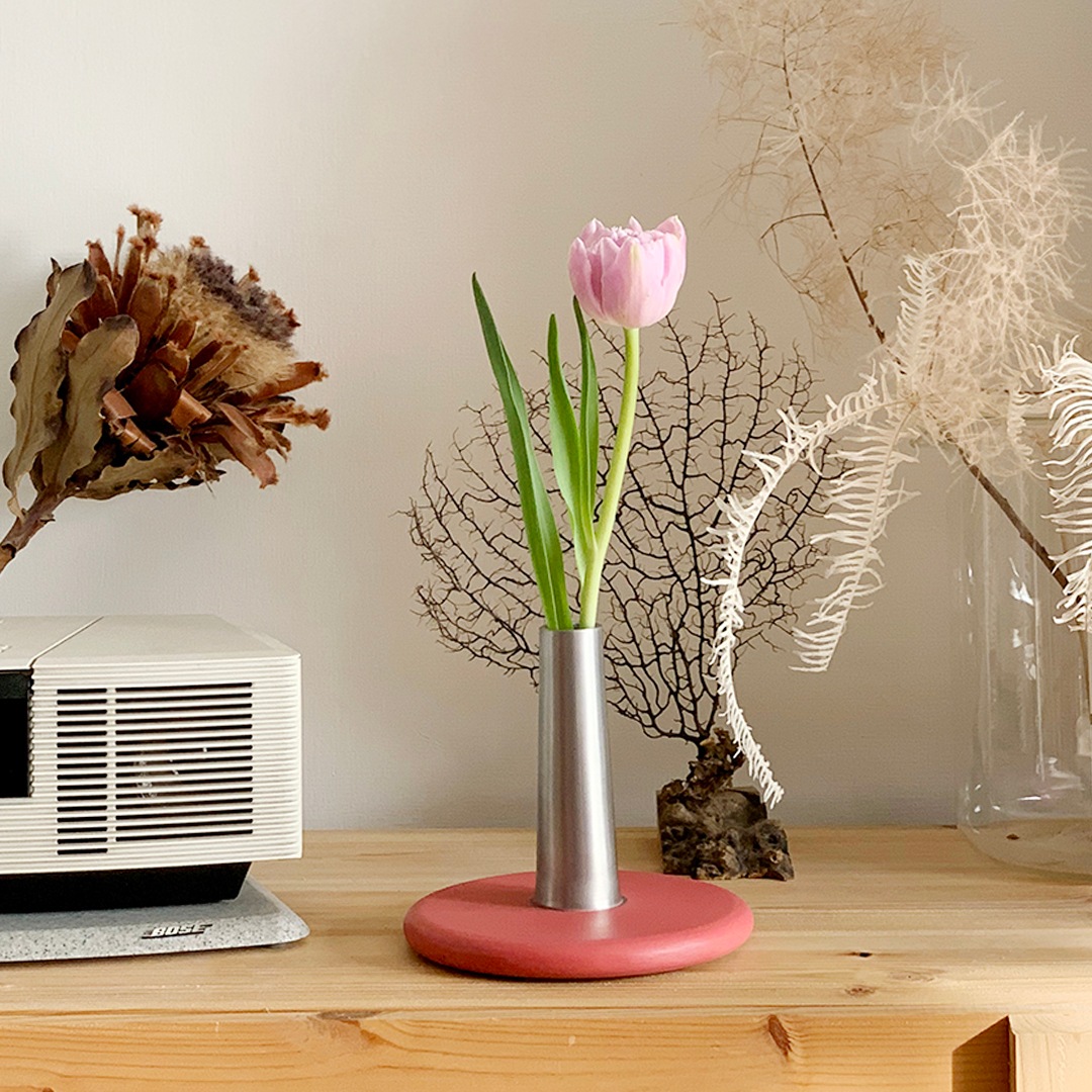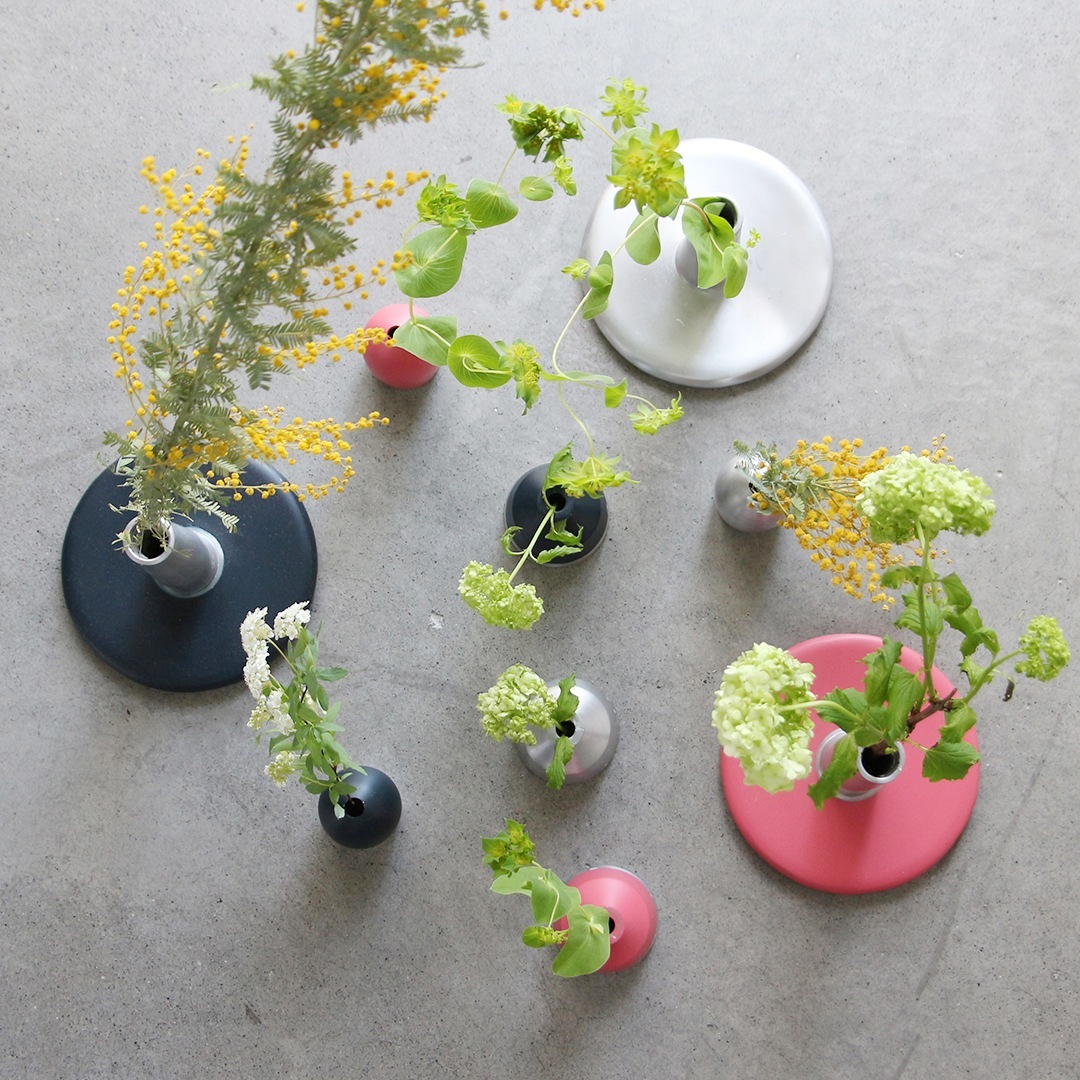 薄い円盤状のベースに伸びた花を。今日の一輪を飾れるような口径約20mmのアルミ製フラワーベース。