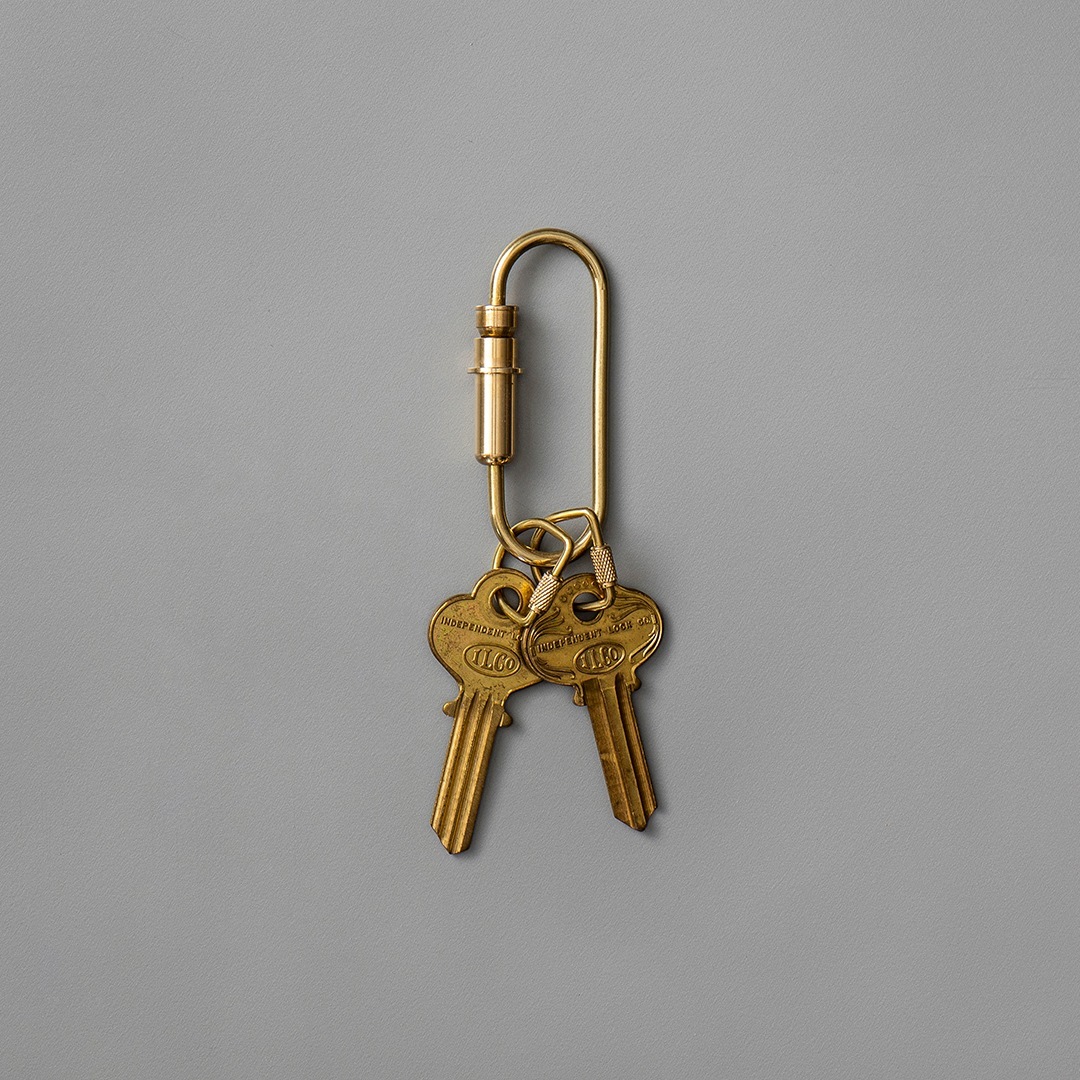 銃弾をモチーフにした"BULLET"シリーズのキーリング。真鍮を削り出した重厚なカラビナタイプ。