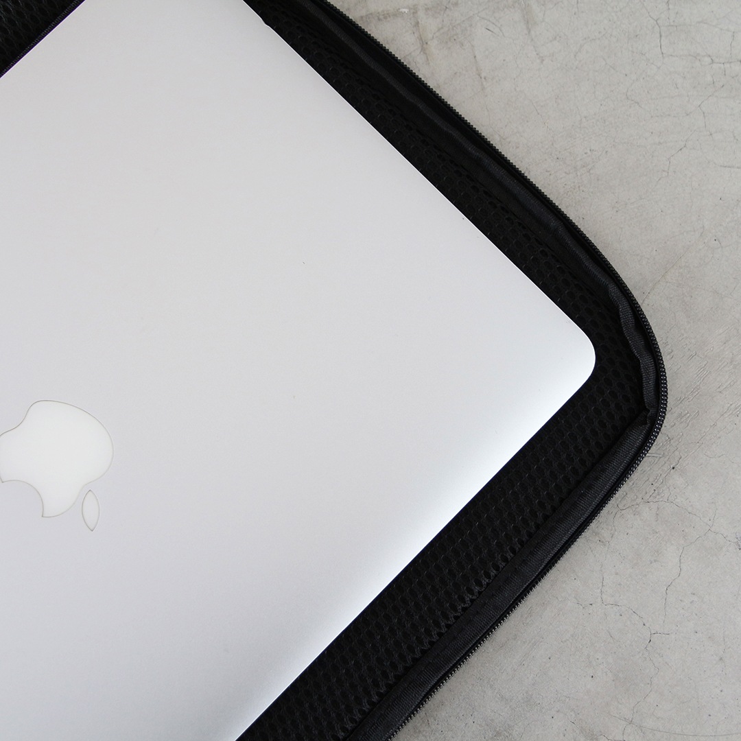 内側には大切なPC、タブレットを守ってくれるクッション性のあるメッシュ生地を採用。ケースは180度開くようになっているのでケースに入れたままPC作業が可能です。