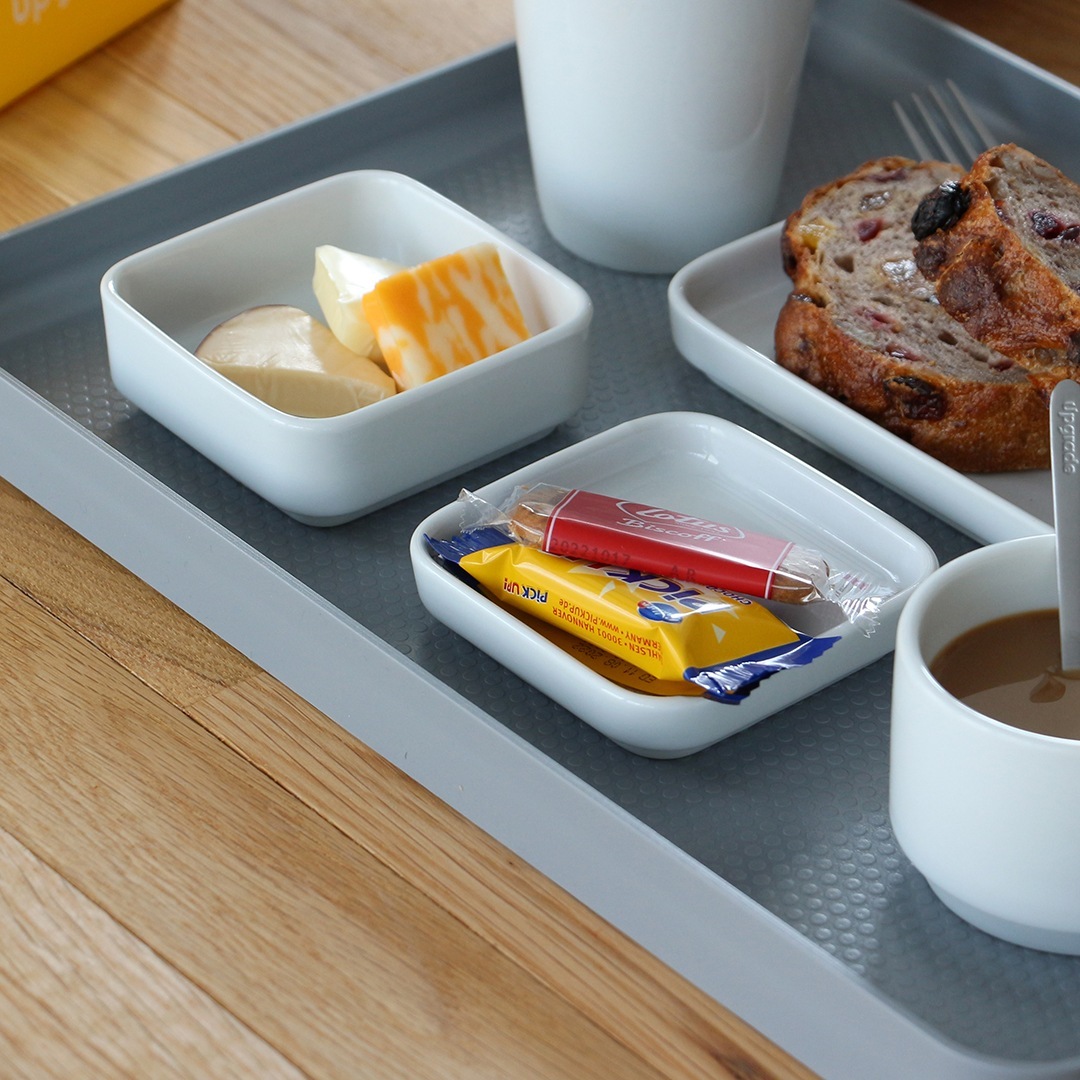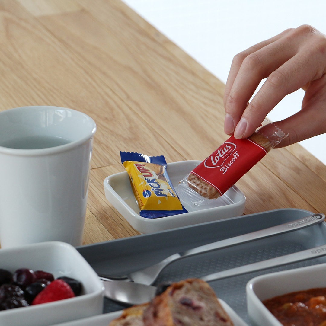 組み合わせ可能かつスタッキング出来る食器は、その自由性と高いデザイン性によりドイツの航空会社を始め様々な航空会社に採用され、機内サービスに用いられました。