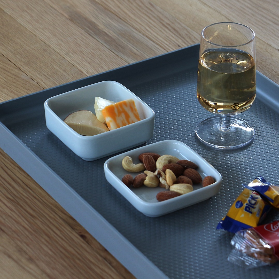 スタッキングもできるので、場所をとらずすっきりと収納できます。実際に機内で使われていたこともあり、限られた座席スペースでもゆっくりと食事時間を取れるように実用性を考慮された仕様になっています。