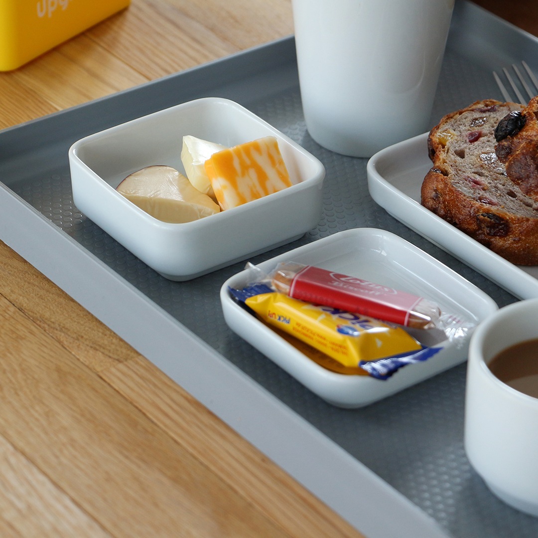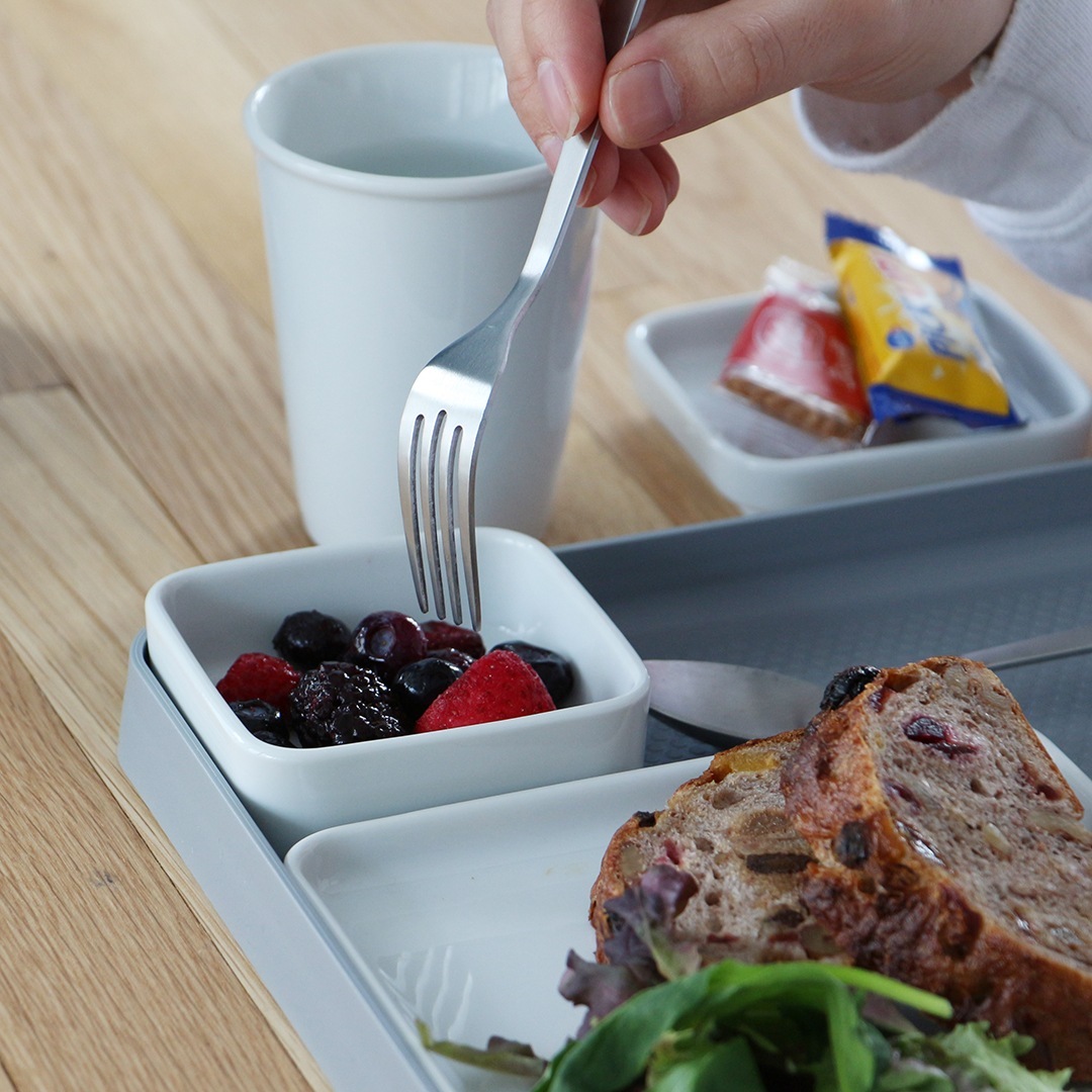 組み合わせ可能かつスタッキング出来る食器は、その自由性と高いデザイン性によりドイツの航空会社を始め様々な航空会社に採用され、機内サービスに用いられました。