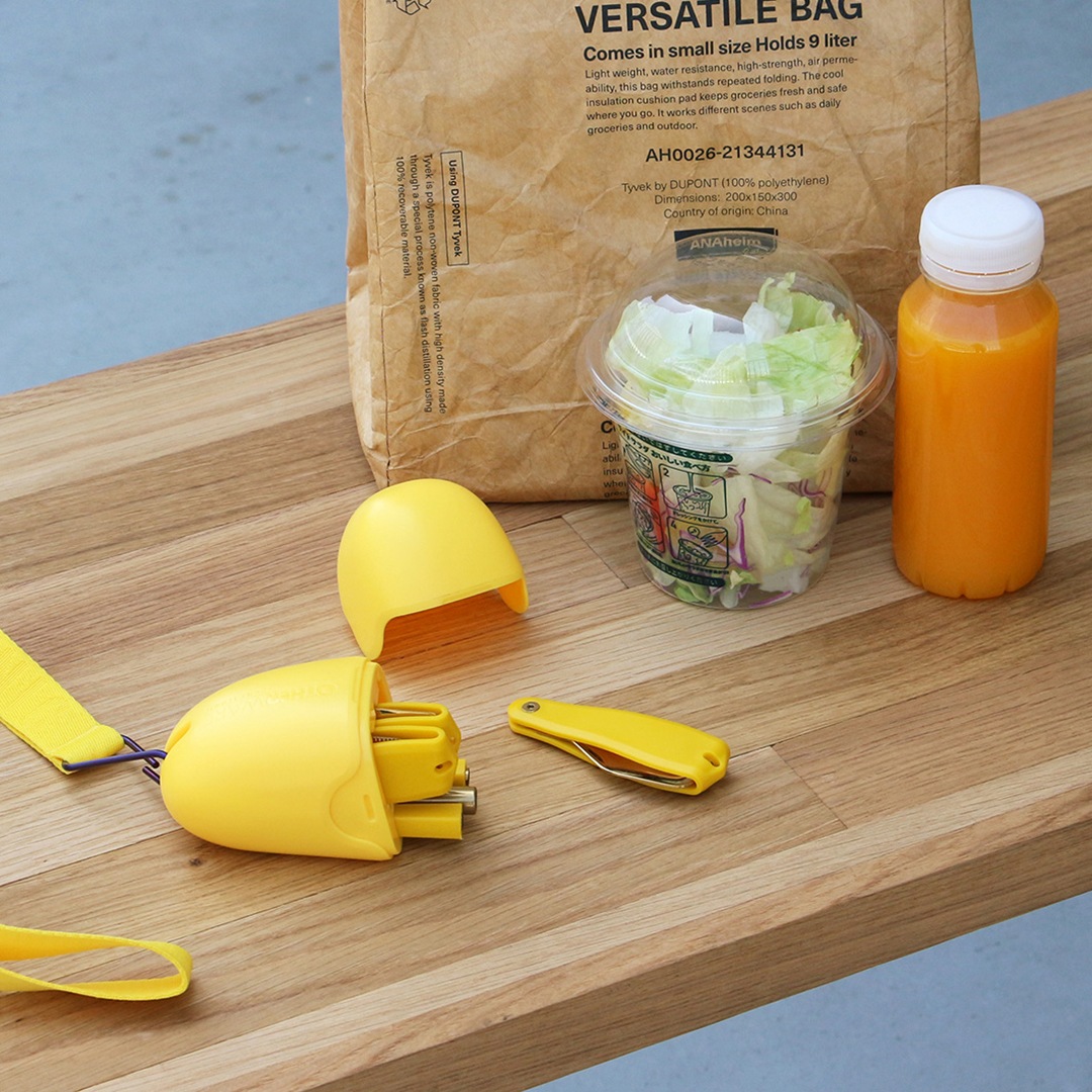 ビビッドなイエローが目を惹く、リサイクル素材で作られたサスティナブルなカトラリーセット。