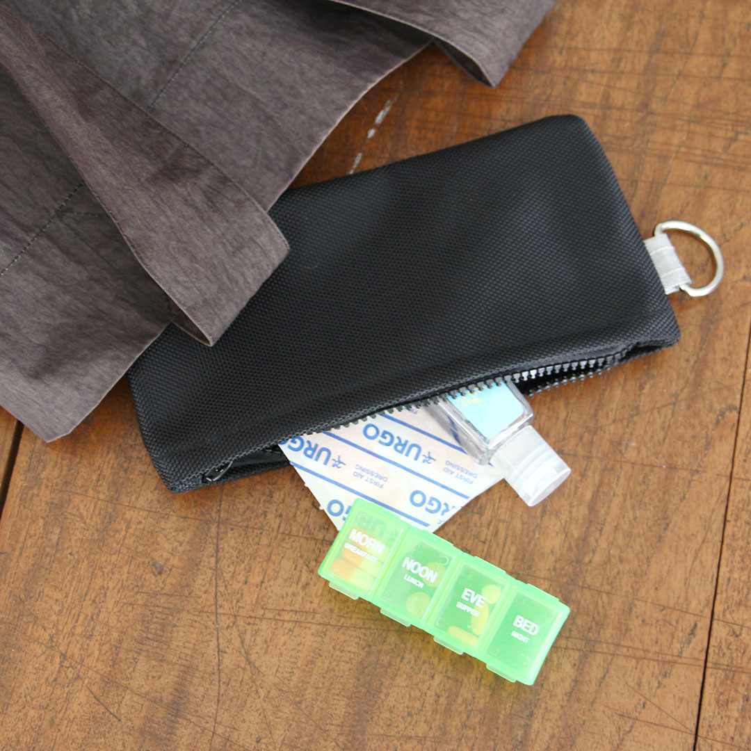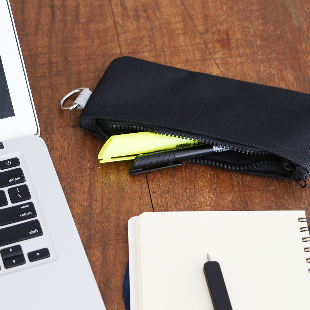 耐久性に優れた1680d ポリエステルを使用したソリッドポーチ。ペンケースからドップキットとしても使用できる5サイズ展開。シンプルながらメタルメッシュを用いたタグがアクセントとなっている。