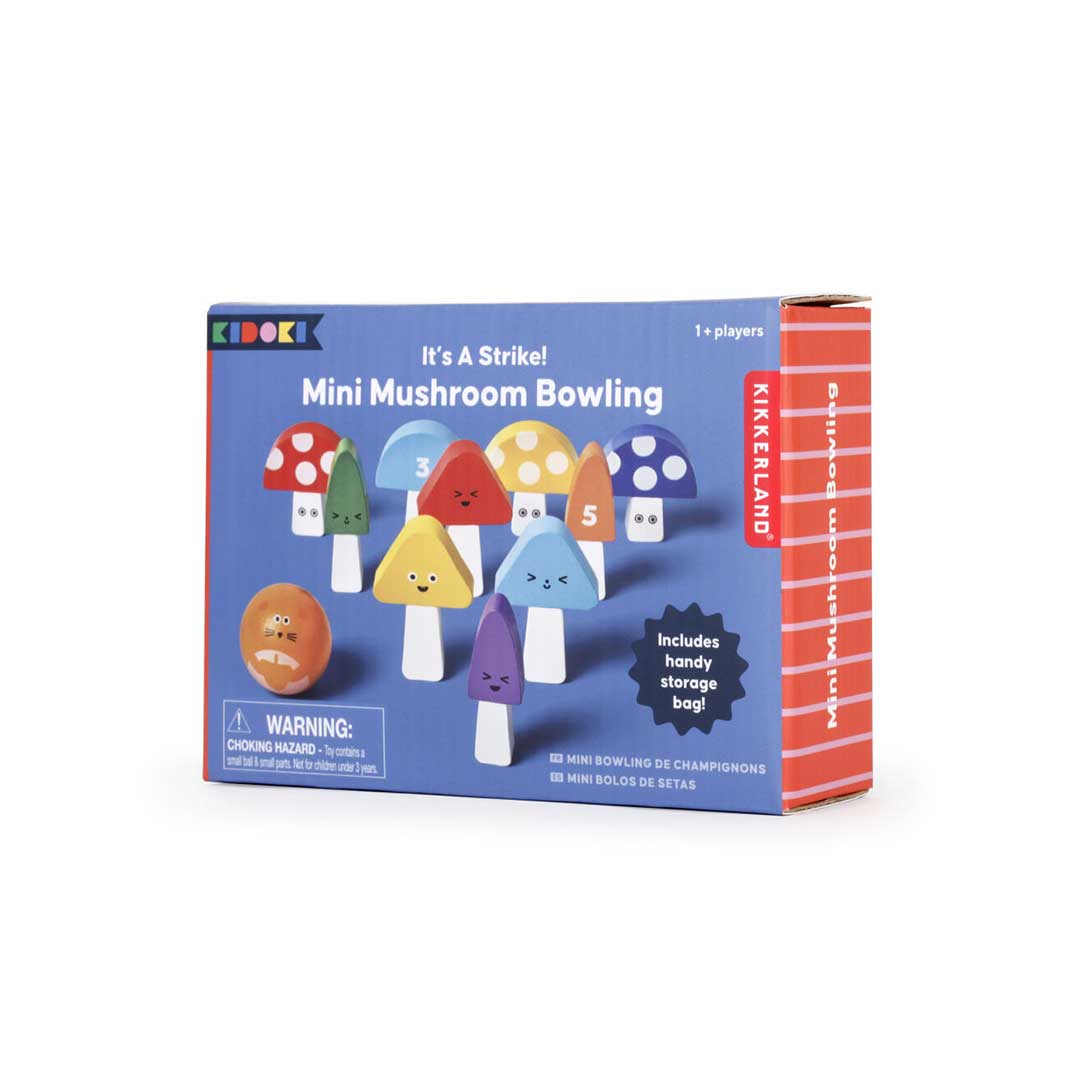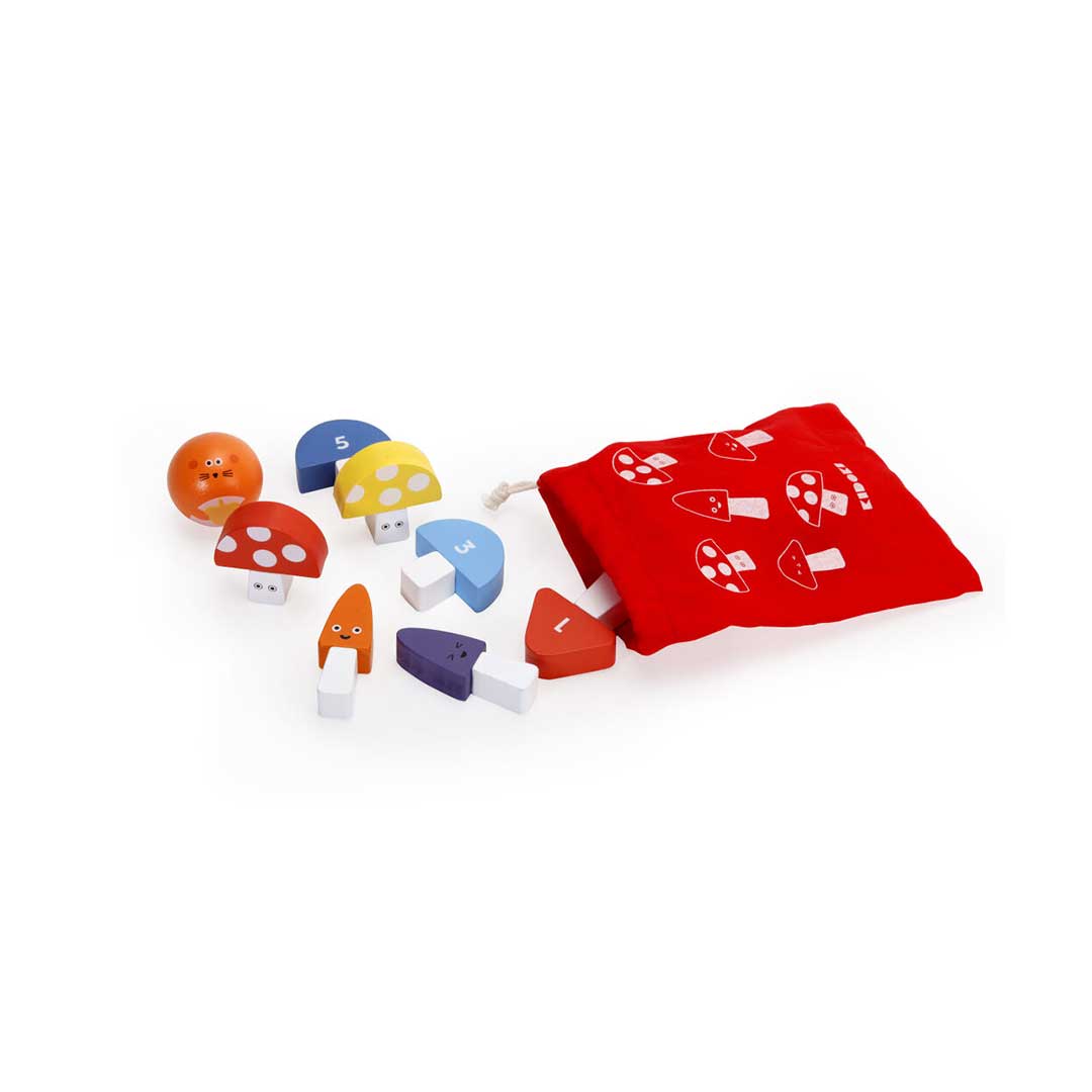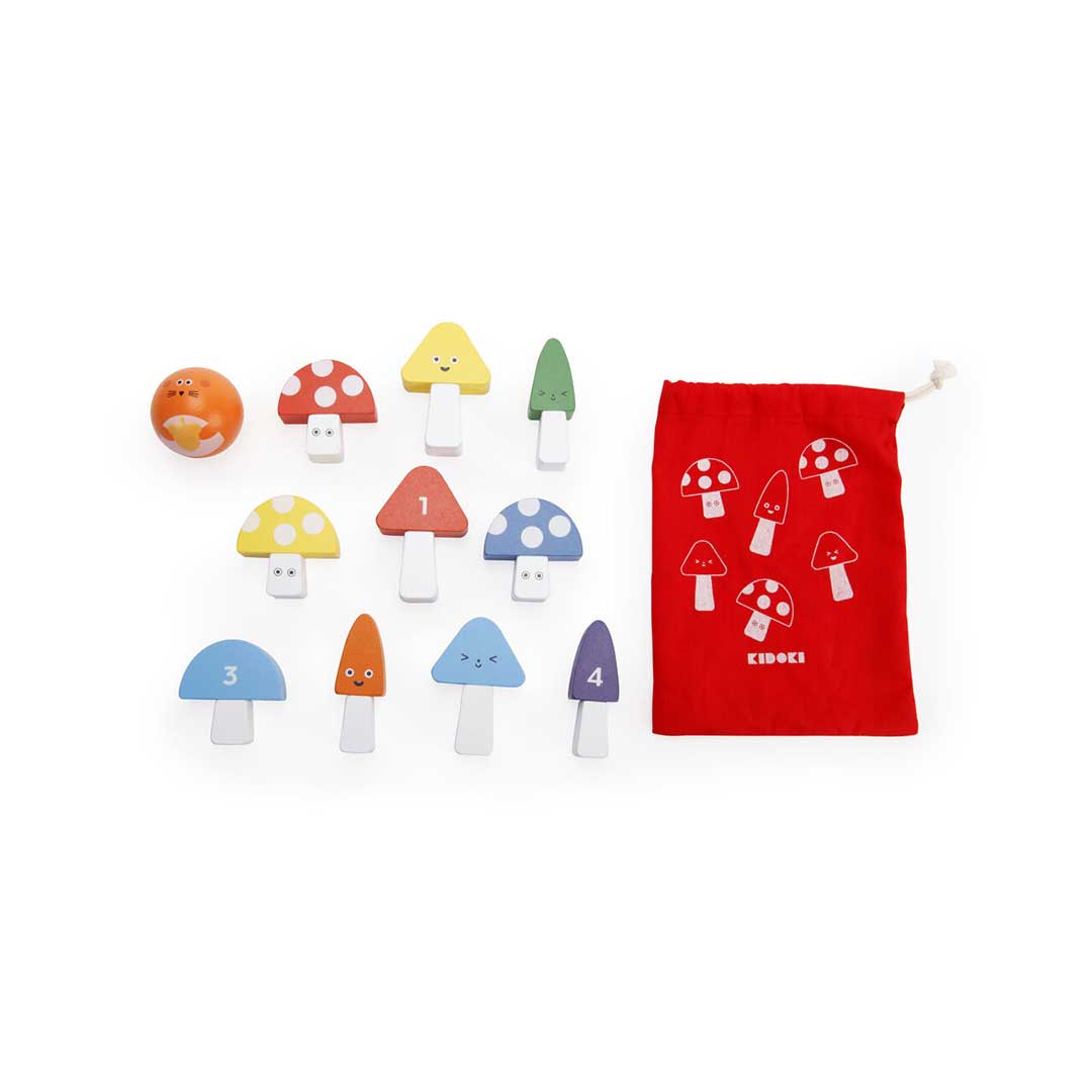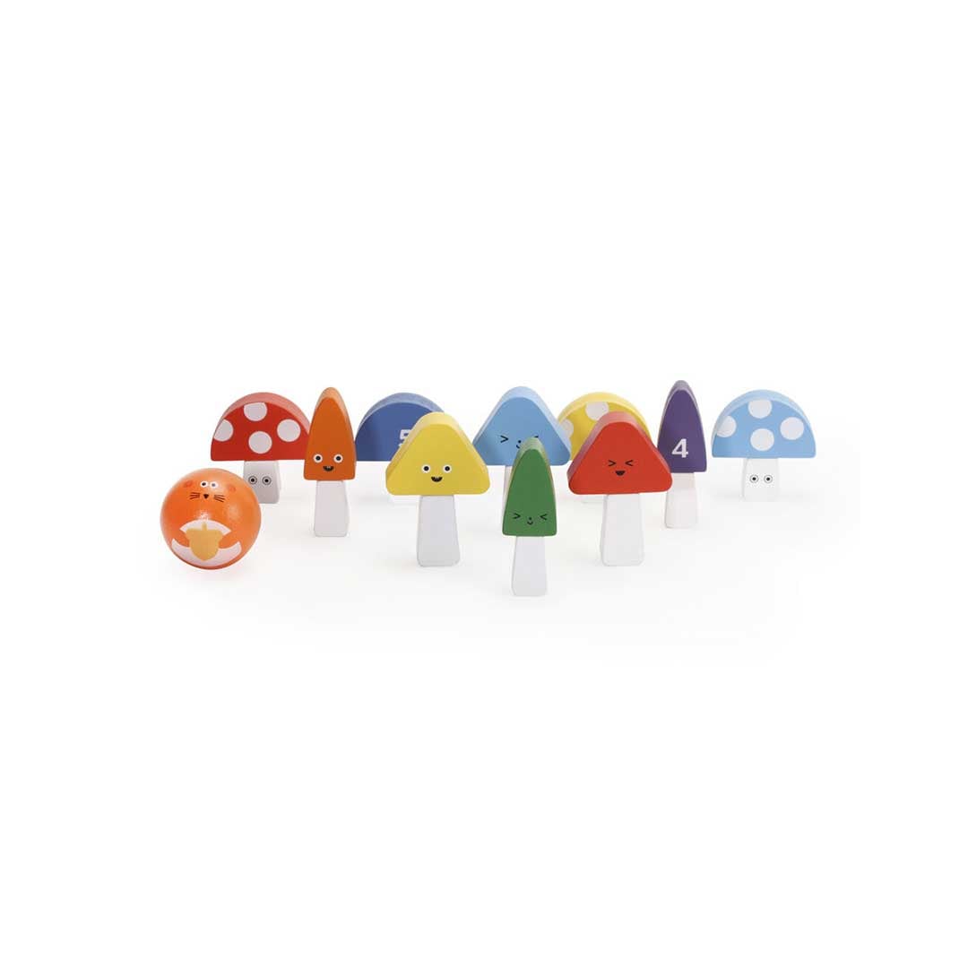 マッシュルームの裏に書かれたスコアを合わせて競う、なんともかわいいミニボーリングゲーム。