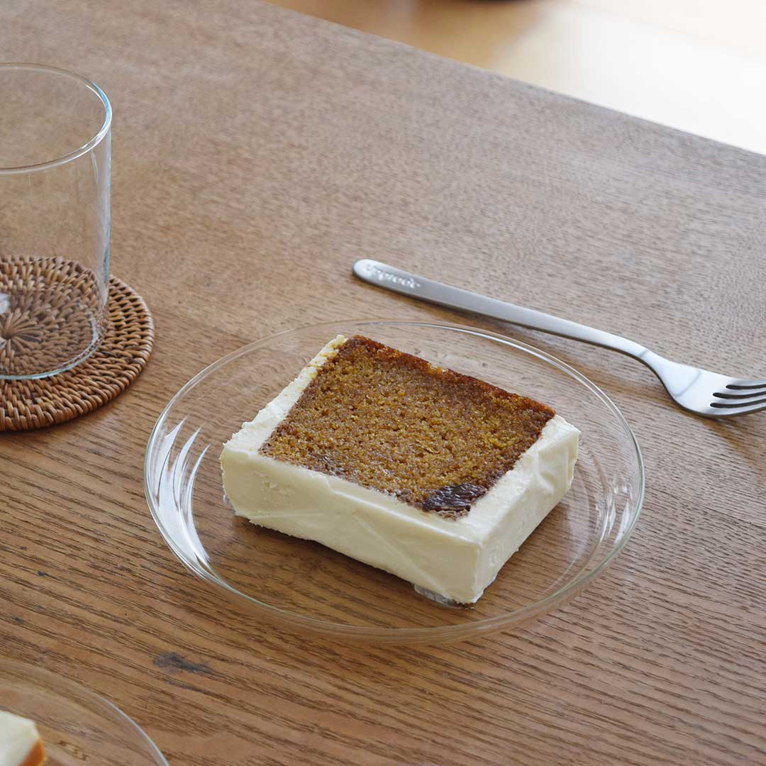 3つのサイズ展開があり、揃えての使用もおすすめ。ミディアムサイズは直径16cmと、ケーキなどのスイーツやサラダ、サイドディッシュ、取り皿などに最適なサイズ。また、同シリーズのグラスと合わせてソーサーとしてもお使いいただけます。