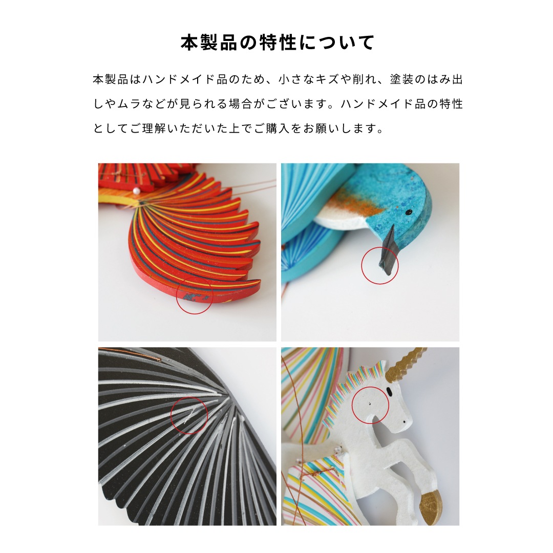 | ・ハンドメイド品の為、サイズや色味には若干の個体差がございますのでご了承ください。 ・小さなキズや削れ、塗装のはみ出しやムラなどが見られる場合がございますがハンドメイド品の特性としてご理解いただいた上でご購入をお願いします。 ・お届け時、製品に梱包資材による細かな粉が付着している場合がございます。気になる場合は乾いた布などで拭き取ってからご使用ください。 ・木製のため、水に濡れない屋内やルーフバルコニーでご使用ください。 ・繊細なバランスで作られているため、小さなお子様の手の届かない場所に設置してください。 ・変色や劣化の原因となるため、直射日光の当たらない場所でご使用ください。 ・モビールの重さに耐えられる場所に設置してください。 |
