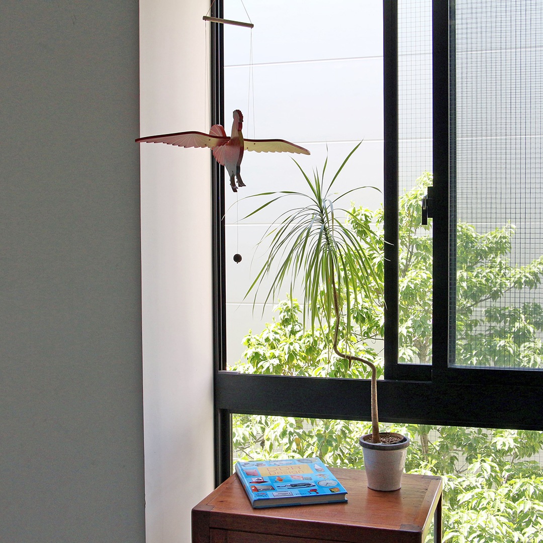 コロンビアの工房で1つひとつハンドメイドで作られるモビール。通常のモビールとは違い、下の紐を引っぱると優雅にふわりと羽ばたく動きが特徴的です。