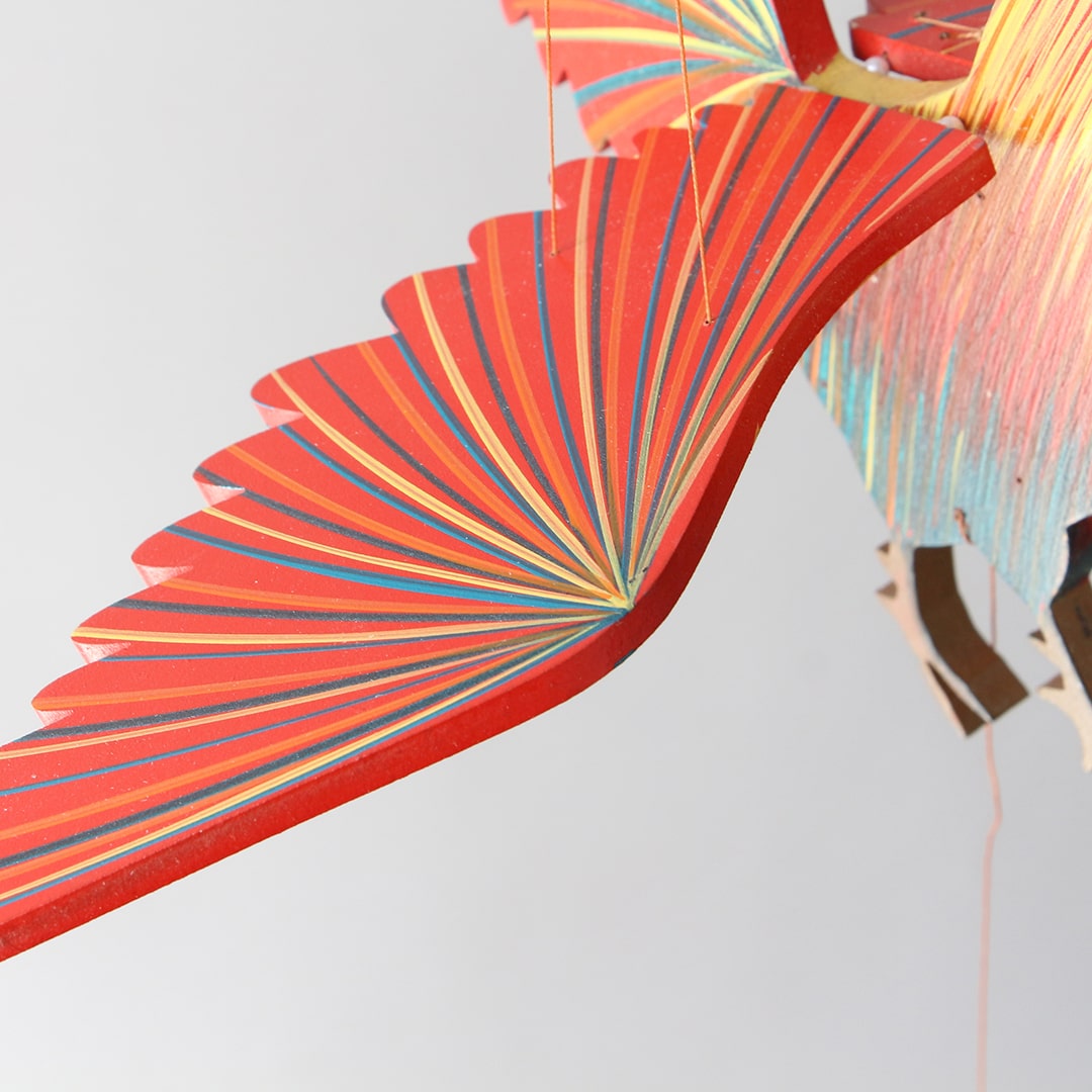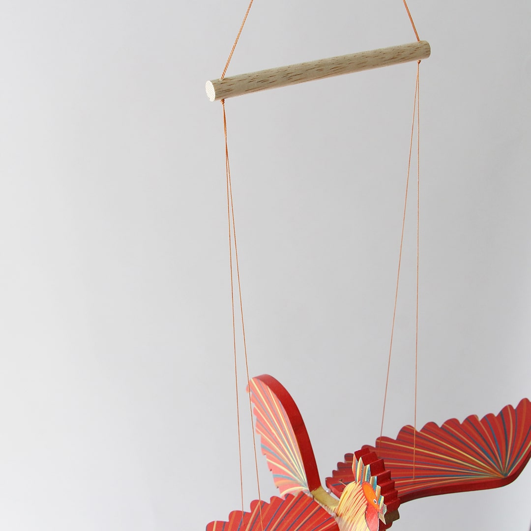 コロンビアの工房で1つひとつハンドメイドで作られるモビール。通常のモビールとは違い、下の紐を引っぱると優雅に羽ばたく動きが特徴的です。
