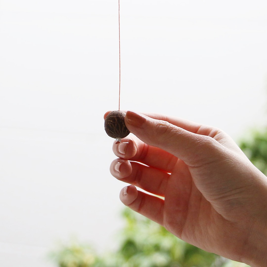 紐の持ち手には植物の象牙と言われるタグアナッツ(象牙椰子の実)を取り入れています。南国を感じる配色、きめ細やかな色彩が落とし込まれていて、アートオブジェとしても美しく、インテリアのアクセントとなってくれることでしょう。