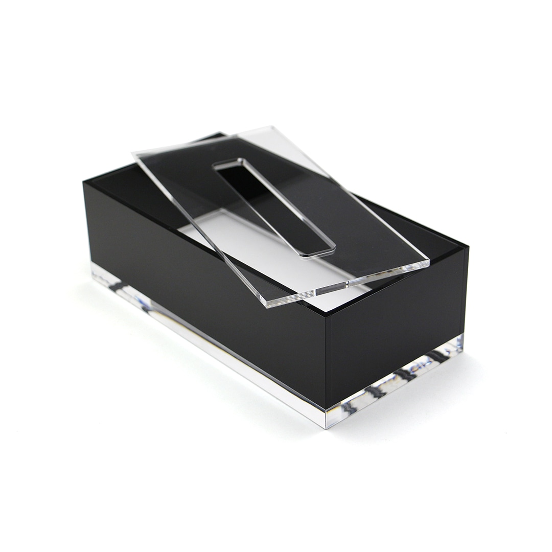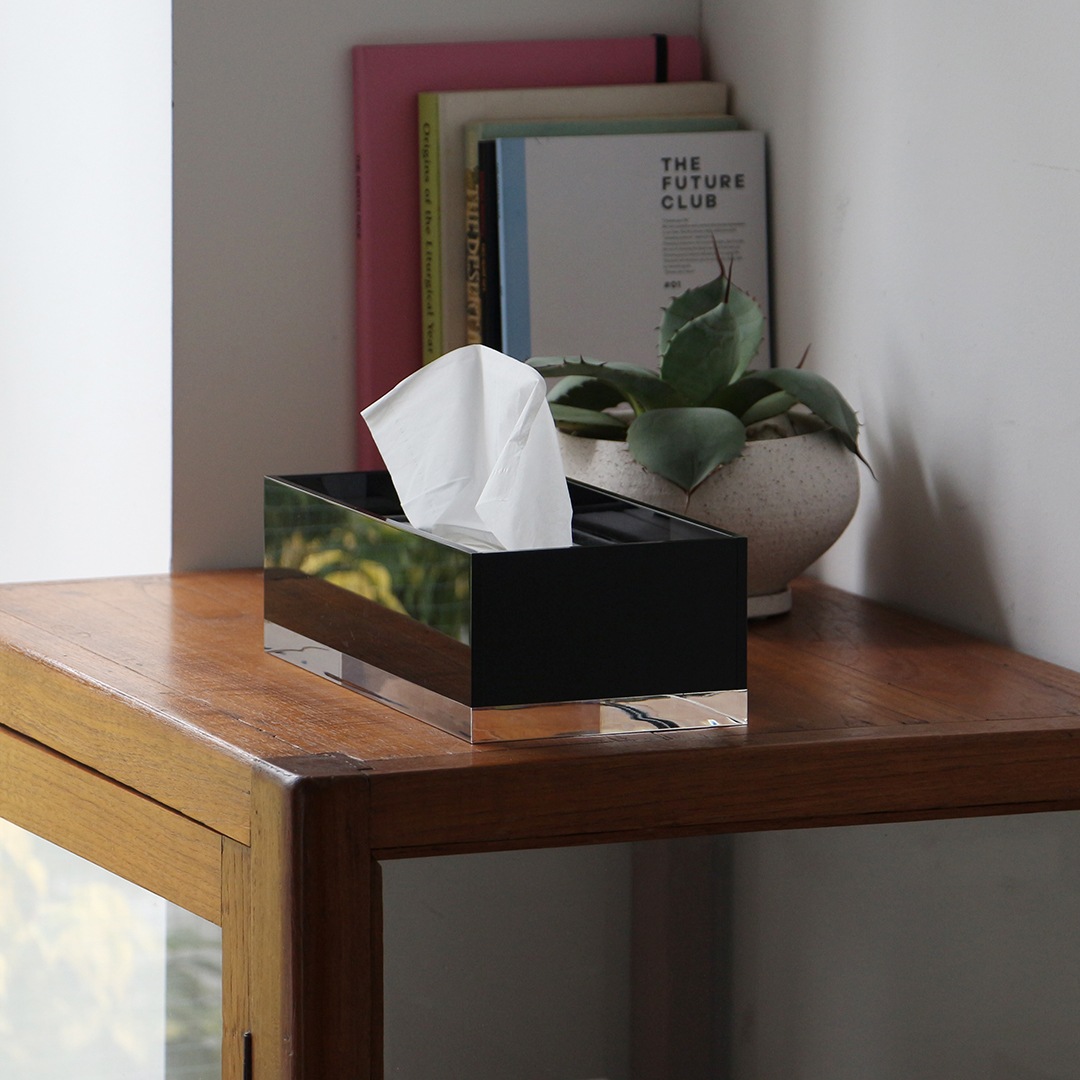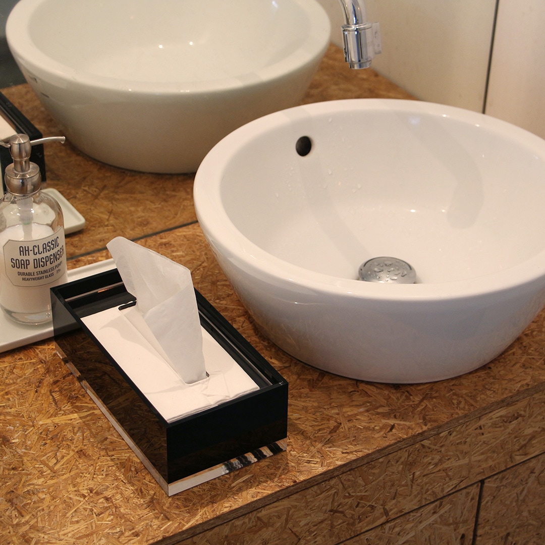 アクリルはガラスよりも透明度が高い素材とされ、洗練された雰囲気を演出するだけでなく、中身のペーパーの残量が見やすいという使い勝手にも優れています。底面はあえて厚みのある15mmのクリアアクリルを使用し、程よい重量があることでティッシュを引き出す際にもボックスが動きづらいのも嬉しいポイント。また、アクリルは耐水性にも優れていることで洗面所などの水回りとも相性がよく、各コーナーに上質感を演出してくれます。
