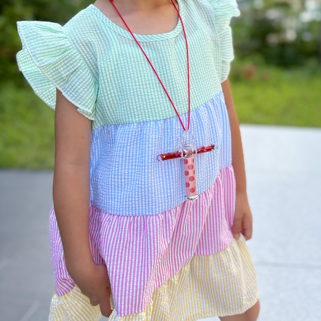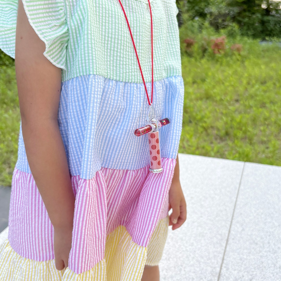 液体の中にはきれいなビーズやスパンコールなどが入っており、覗いている時に試験管部分を指でクルクルと回転させると、さらに幻想的な様子が楽しめます。ナイロン紐が付属しているので首に掛けたり、外出・旅行先などどこへでも持ち運ぶことができます。小さなお子さんでも扱いやすいミニサイズは、パーティーやお祝いのギフトとしてもおすすめです。