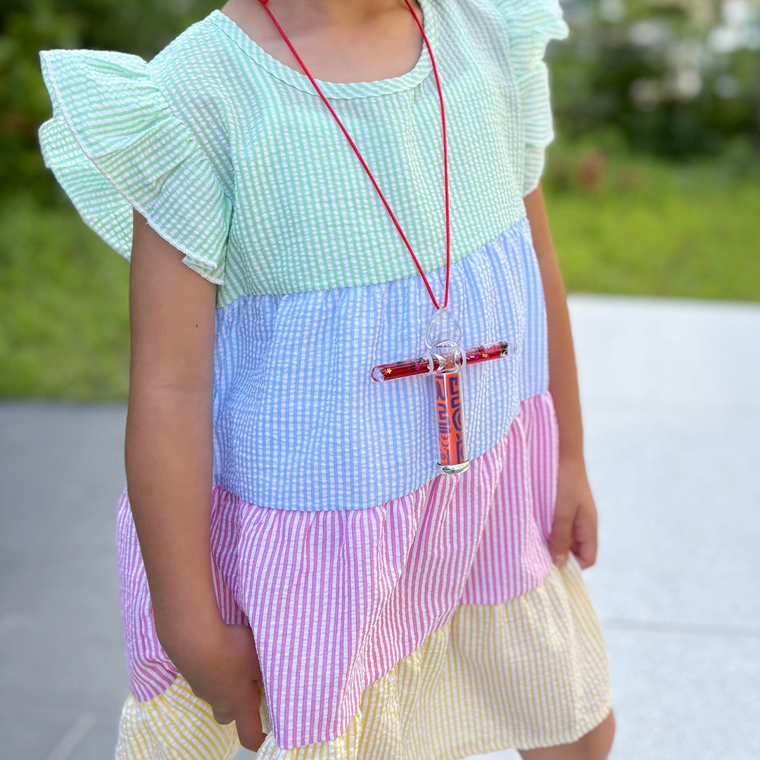 液体の中にはきれいなビーズやスパンコールなどが入っており、覗いている時に試験管部分を指でクルクルと回転させると、さらに幻想的な様子が楽しめます。ナイロン紐が付属しているので首に掛けたり、外出・旅行先などどこへでも持ち運ぶことができます。小さなお子さんでも扱いやすいミニサイズは、パーティーやお祝いのギフトとしてもおすすめです。
