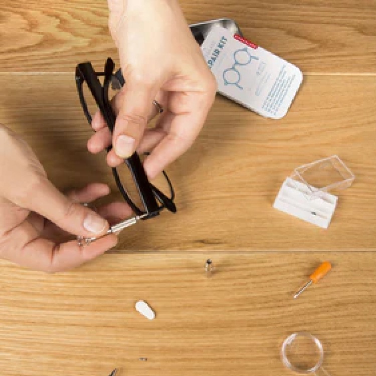 手のひらサイズのスチール製のケースに入った、めがね修理キット。いざという時だけではなく、普段のお手入れ用に持っておきたい。