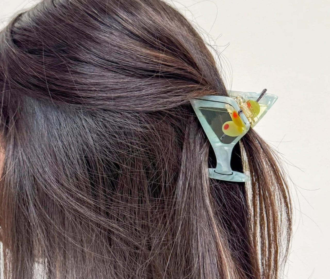サンフランシスコを拠点とするアーティスト、ジェニー・レニックによるブランド Jenny Lemons のマティーニカクテルデザインのヘアクリップ。