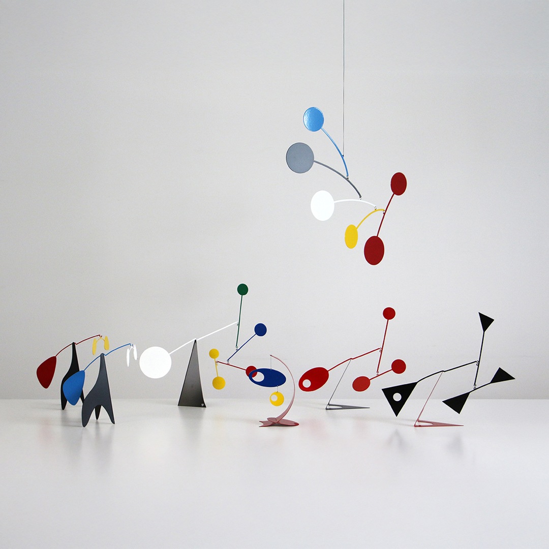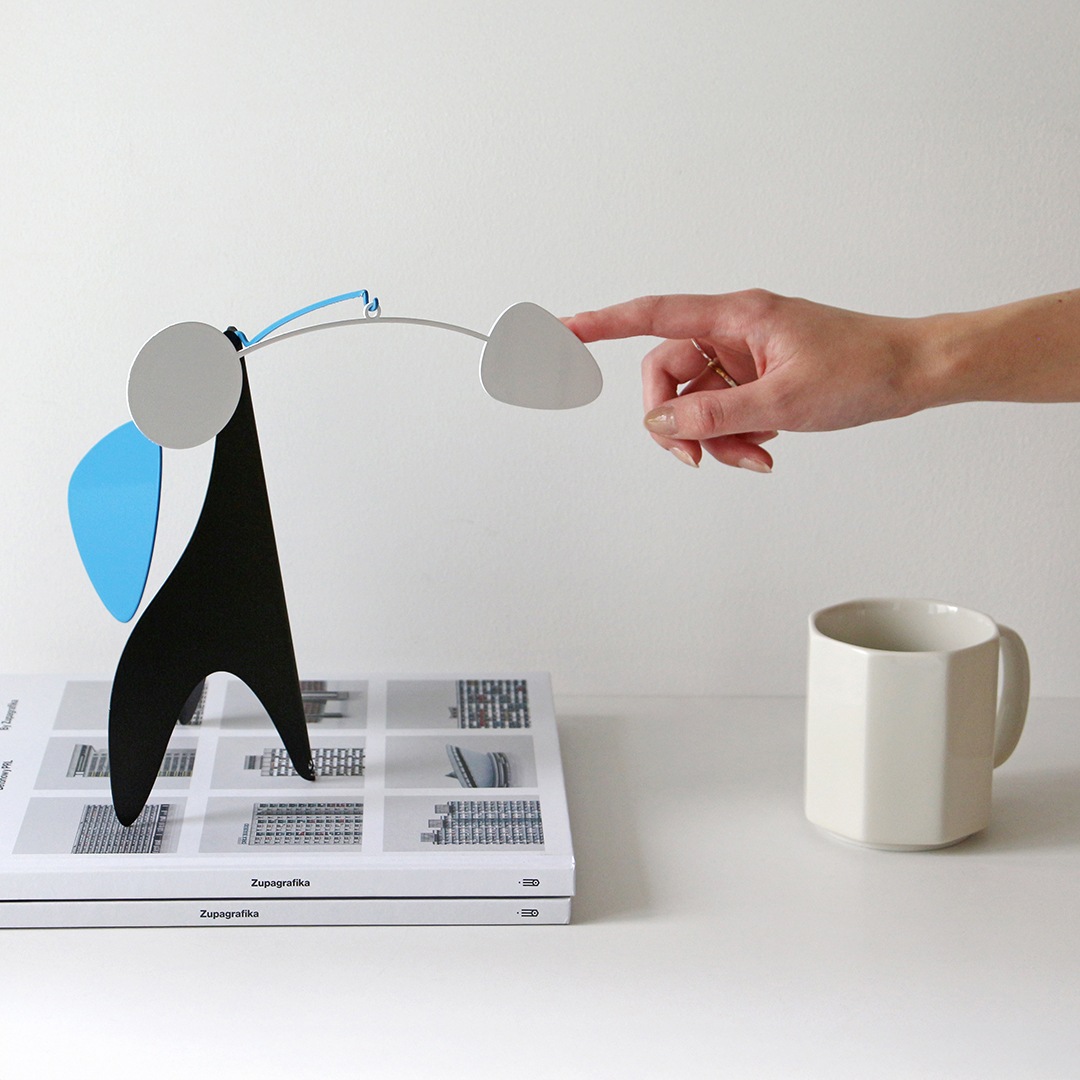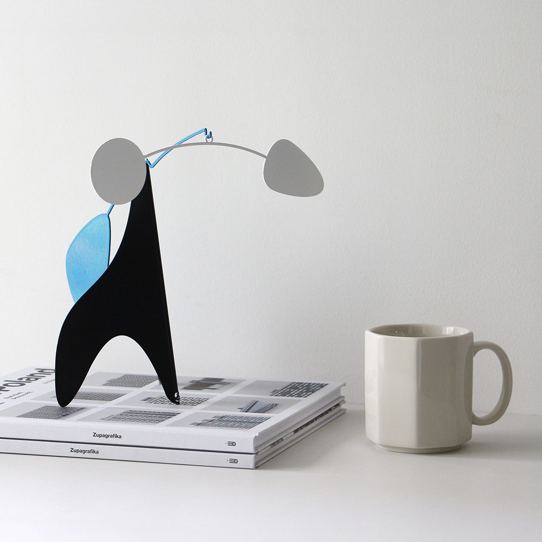 動く彫刻 モビール を発明した"アレクサンダー・カルダー"のデザインを彷彿とさせる有機的かつ繊細なフォルム。そしてバウハウスを連想させるブルー・ホワイト・ブラックのシンプルかつ明快な配色が落ち着いた印象を与えてくれるモビールオブジェです。
