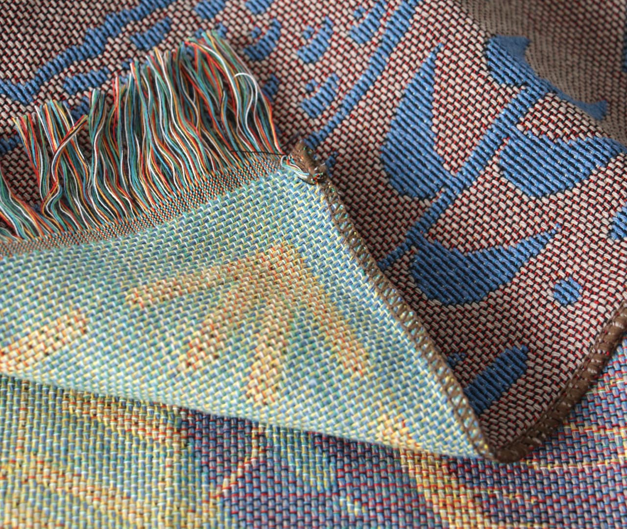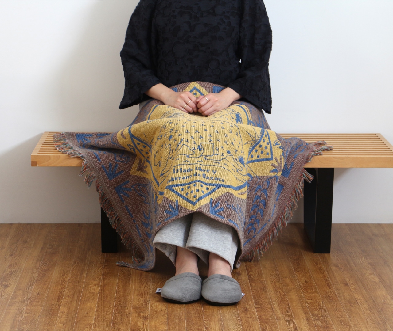 素材はポリエステルの耐久性とコットンの通気性の両方を特性を備えたポリエステルコットン生地。少し厚みがありながらも艶感があり、触り心地がよく、さらには洗濯OKと季節を問わず通年ご使用いただける素材感です。足元が少し冷える日はさっと広げて快適に過ごせる、暮らしのなかで持っておきたい1枚です。