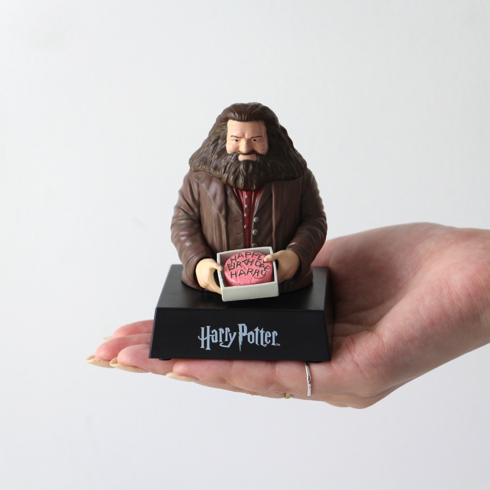 台座の背面のボタンを押すと「You're a wizard, Harry(君は魔法使いだ)」という印象的なセリフとともに、ハグリットが11歳のハリーに誕生日ケーキを手渡す感動の場面をモチーフにしています。ケーキの文字「HAPPEE BIRTHDAE」と、ハグリットの温かさが伝わるデザインが魅力。