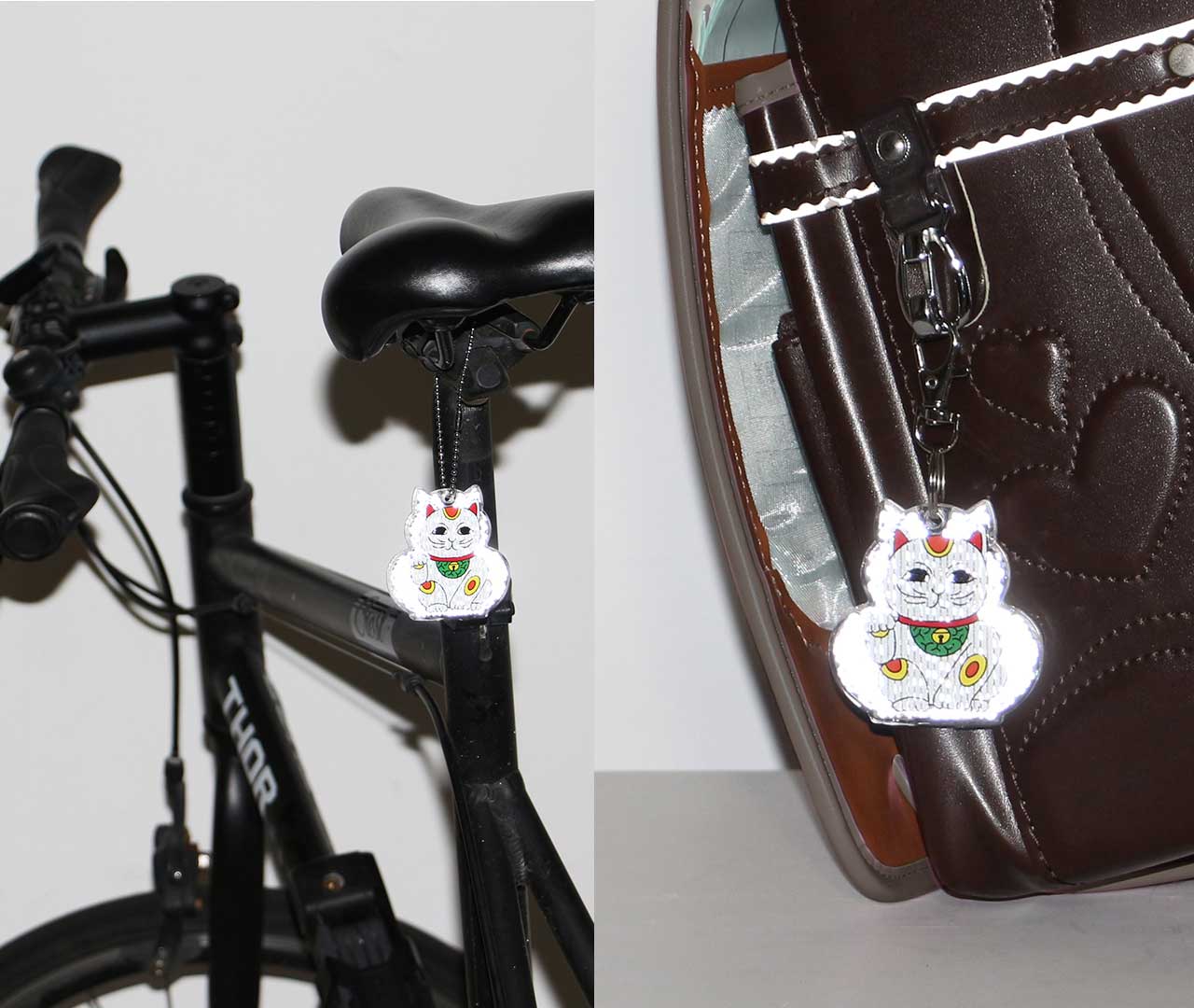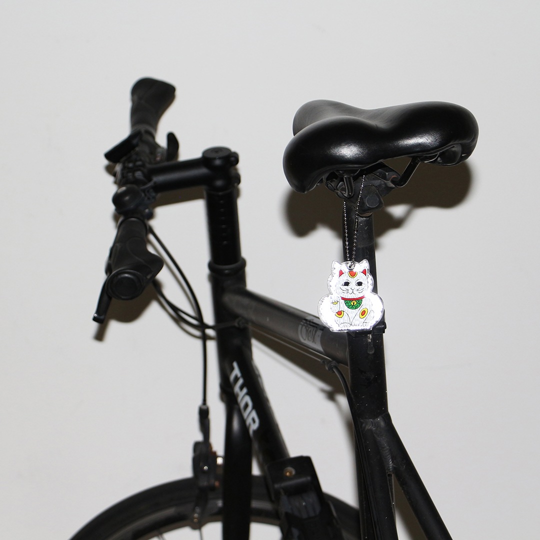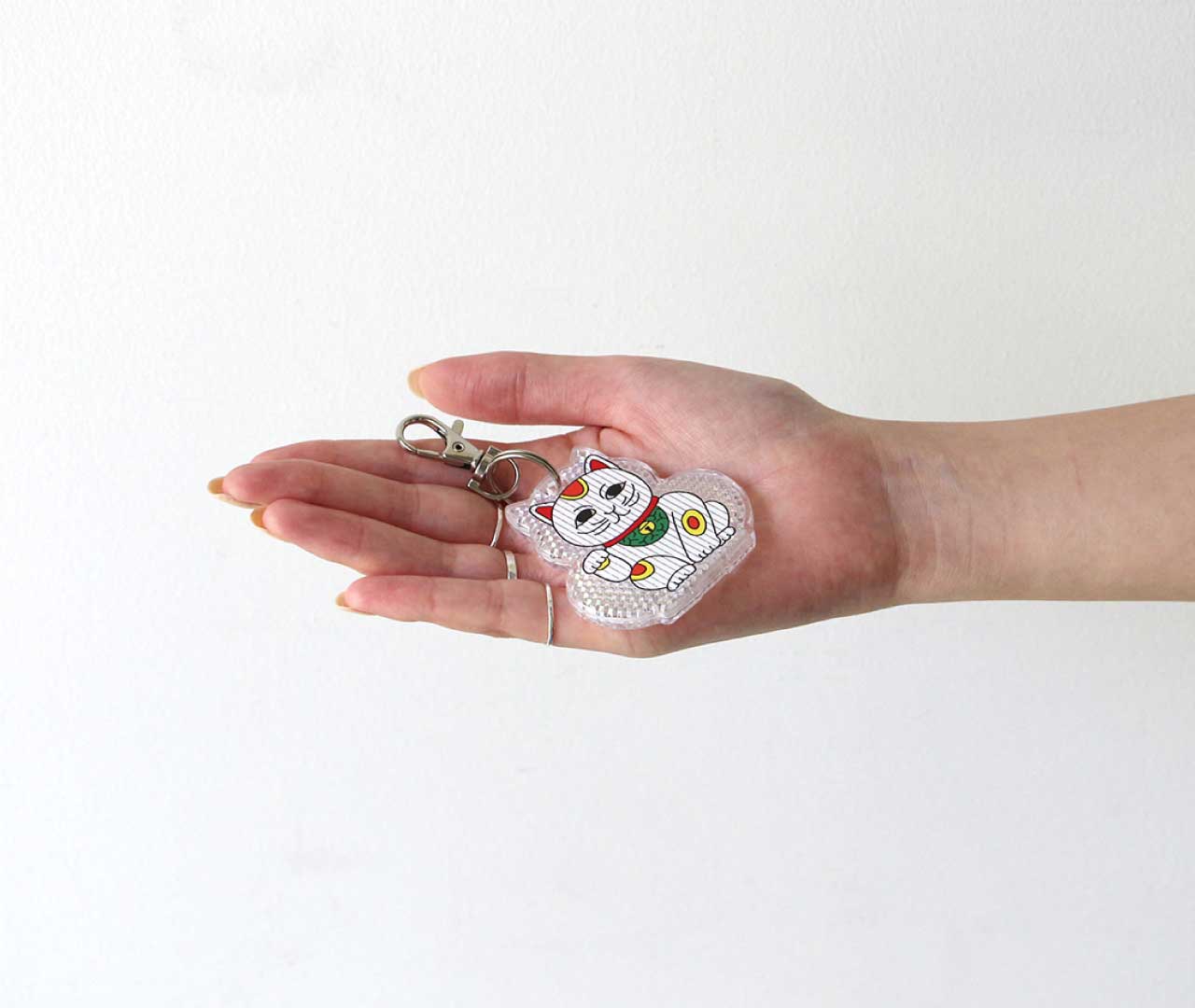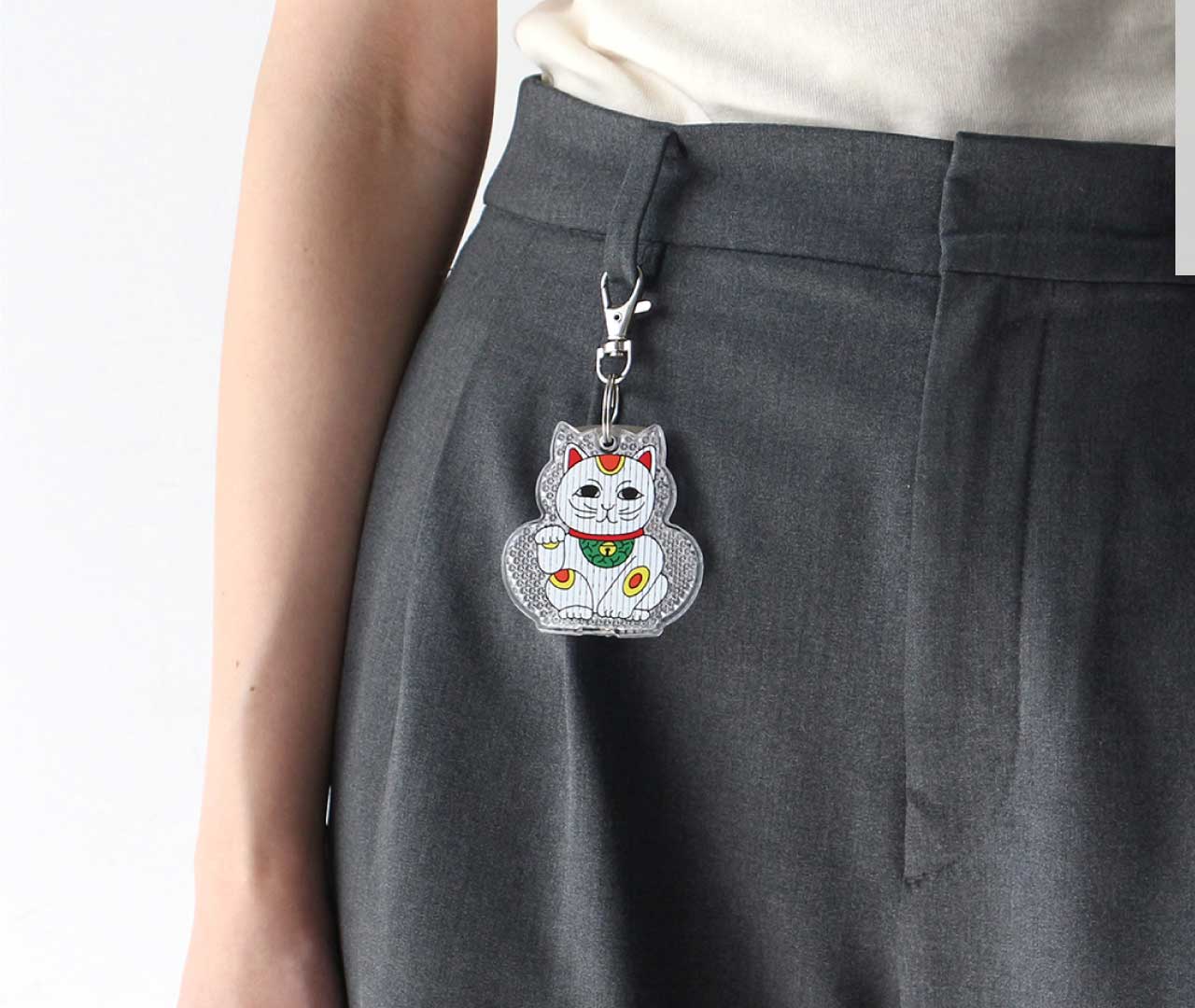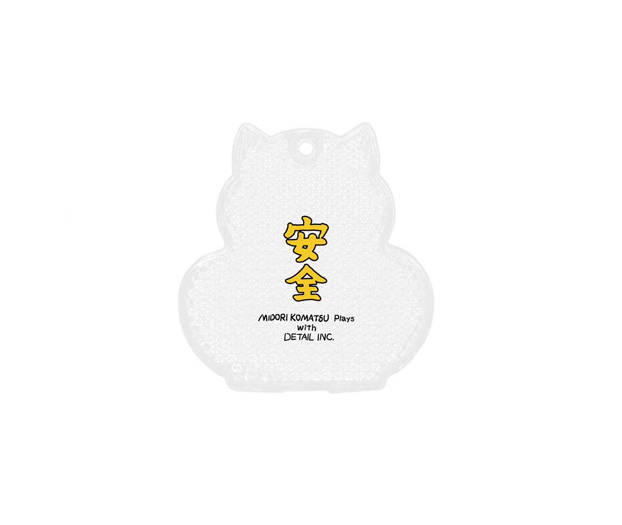 ちょっとシュールで愛らしい表情の招き猫がこちらを見つめる、癒し系のリフレクター。裏面には筆文字風の「安全」の文字がデザインされ、お守りのように日常の安全を見守ってくれます。