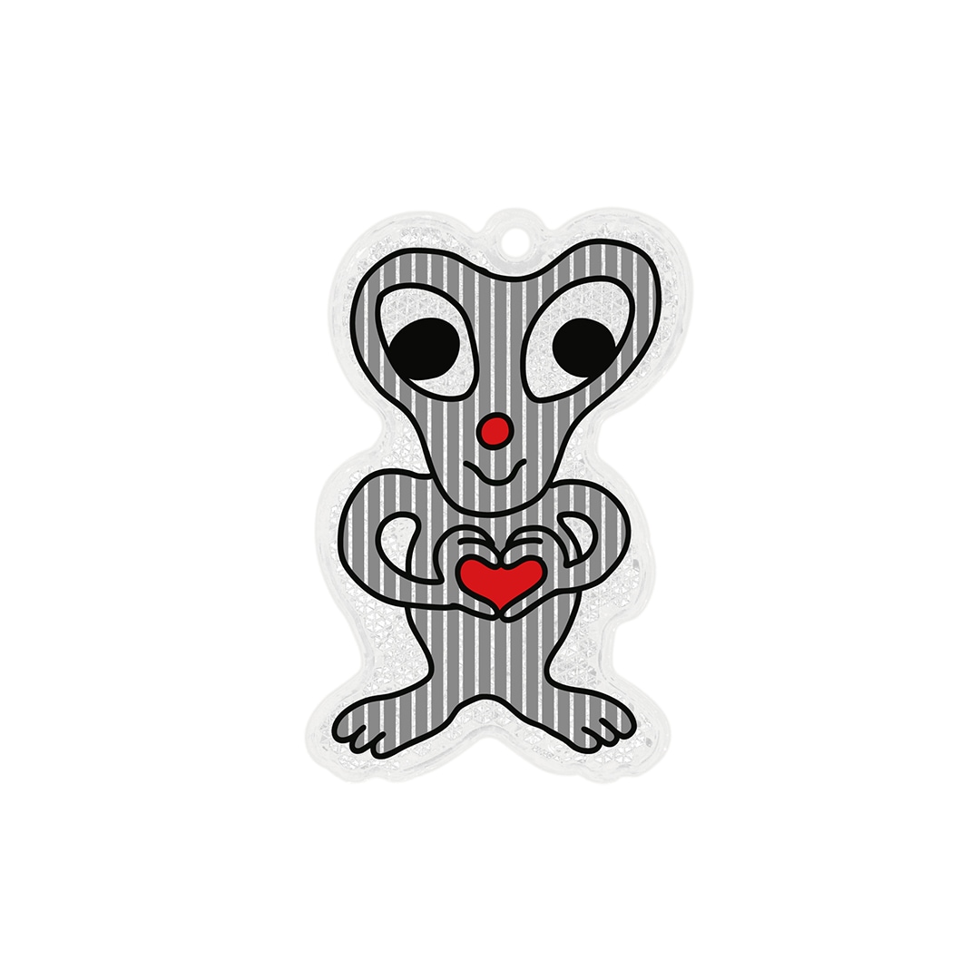 かわいい表情でこちらを見つめるエイリアン。胸に掲げたハートマークは、地球人への“友好の証”。裏面には地球のイラストが描かれ、平和と友情をテーマにした遊び心あるデザインです。