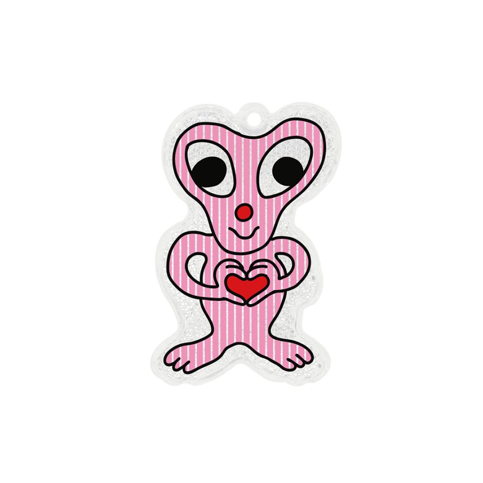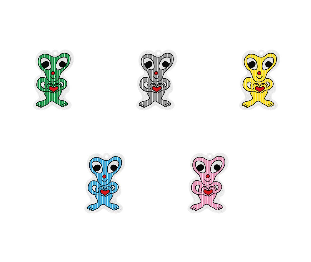 かわいらしい表情でこちらを見つめるエイリアン。胸に掲げたハートマークは、地球人への“友好の証”?ちょっと不思議でどこか優しい、MIDORI KOMATSUらしい世界観が広がるデザインです。