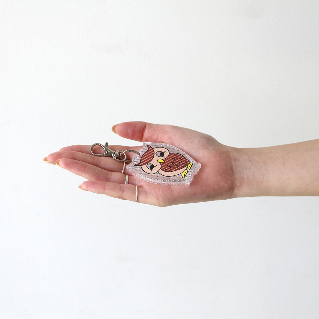 ぷっくりとしたフォルムが愛らしいフクロウが、こちらをじっと見つめる印象的なデザイン。どこかユーモラスで親しみやすい表情は、子どもから大人まで幅広く楽しめます。MIDORI KOMATSUならではの色使いとキャラクター性が光る一枚です。