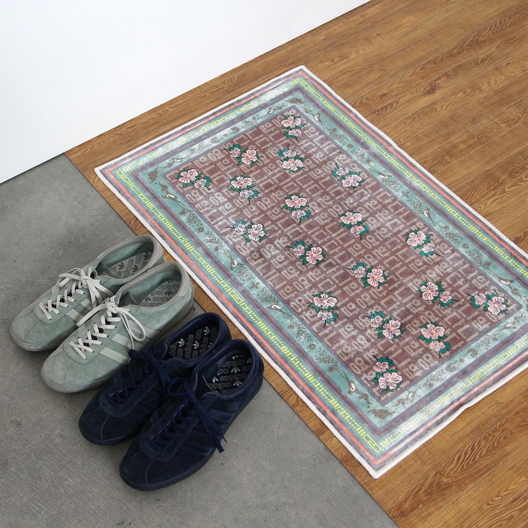 モノグラムのように目を引くグラフィックと、ヴィンテージラグを思わせる程よいかすれ加工が印象的な玄関マット。