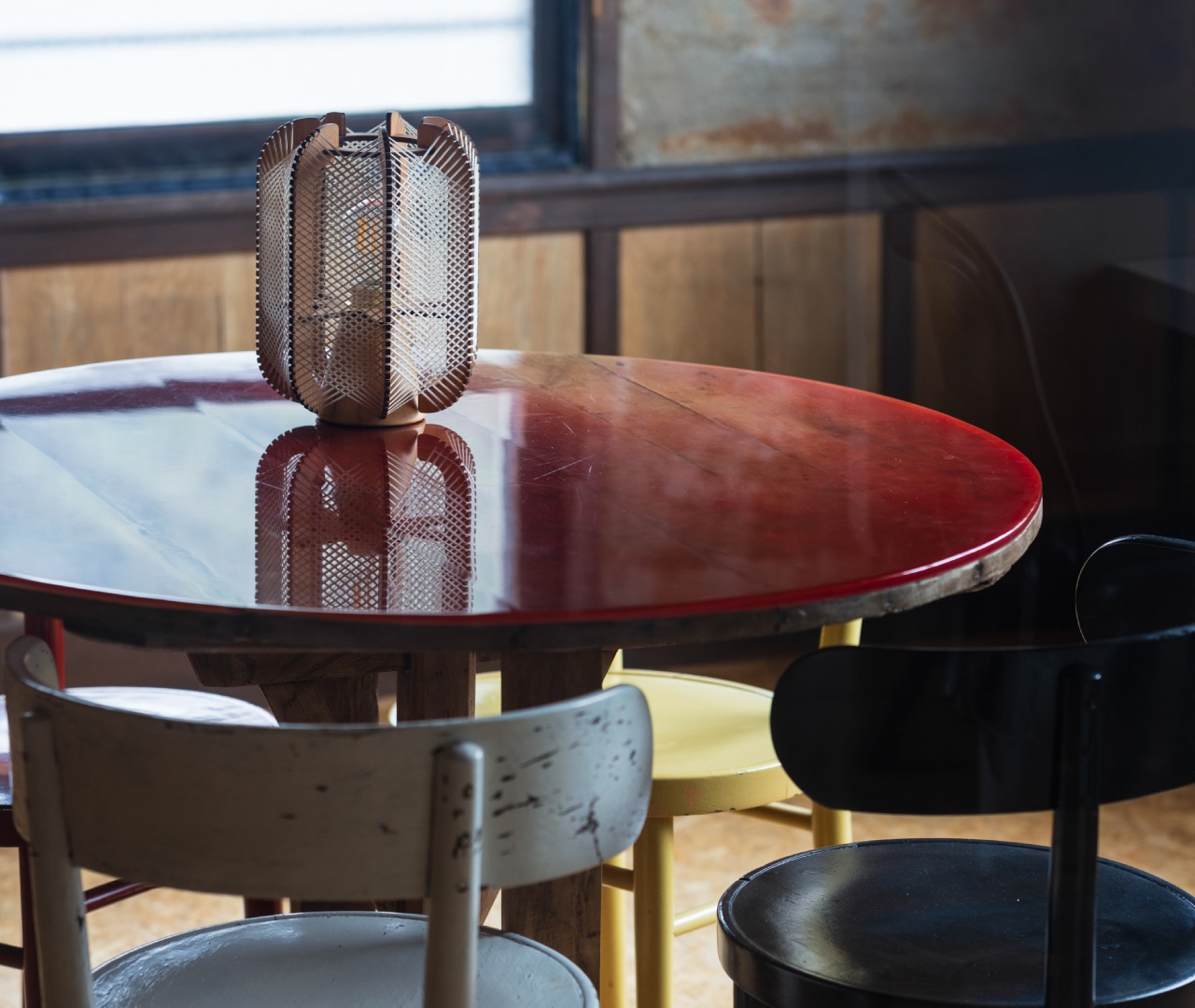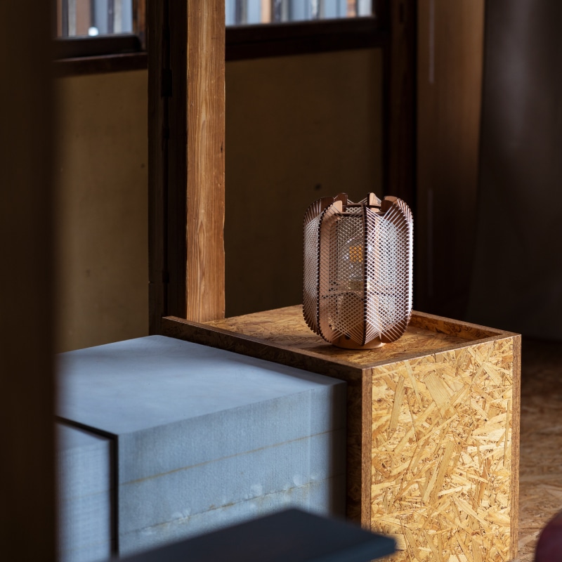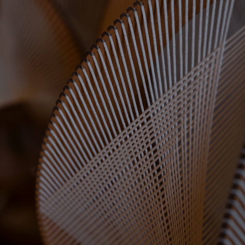 シェードの形状は5種類。そこに施された糸の配列パターンは、まるで幾何学アートのように変化を持たせ、全60種もの豊かなバリエーションを実現しました。一見すると静かな構造物ですが、ひとたび明かりを灯すとその印象は一変します。