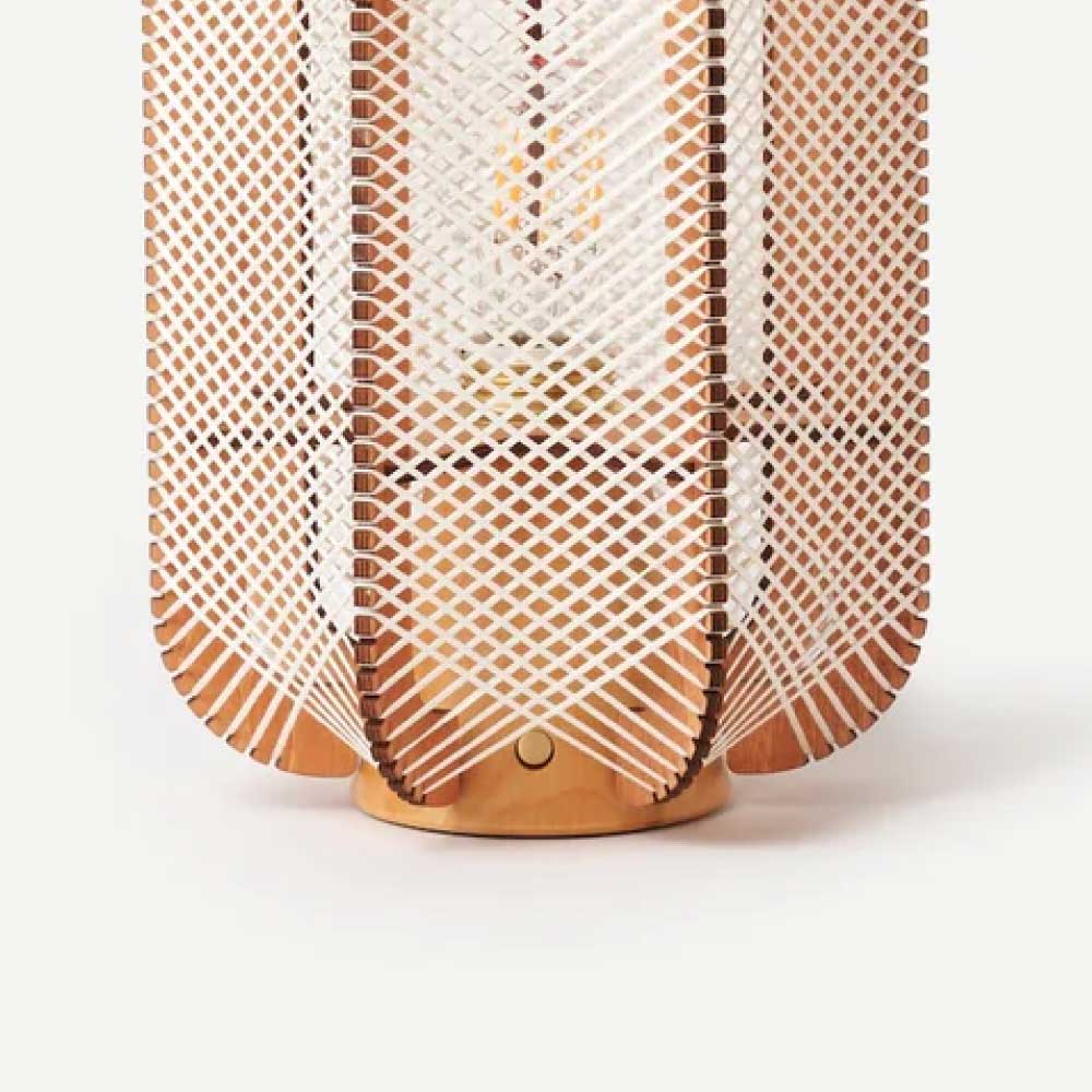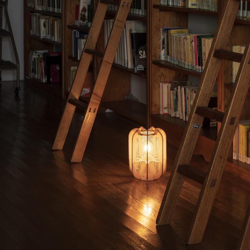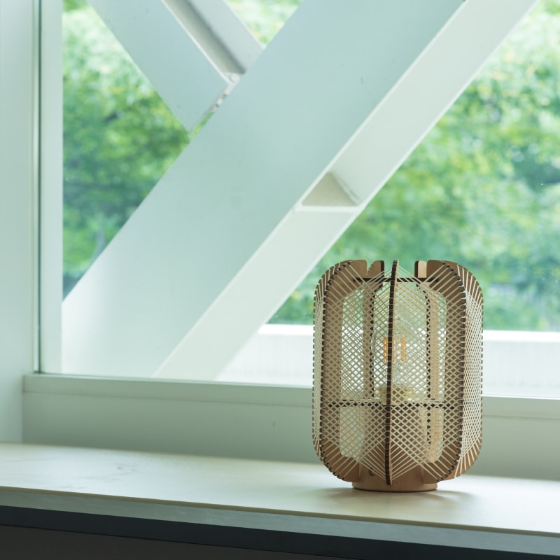 木製フレームに糸を丁寧に編み上げて仕上げたフランス製のポータブルランプ。制作はフランスの家具工房で行われ、木材も現地で製材されたナラやポプラ、ブナなどを使用しています。素材の魅力と職人技が宿る、まさに“Made in France”の逸品です。