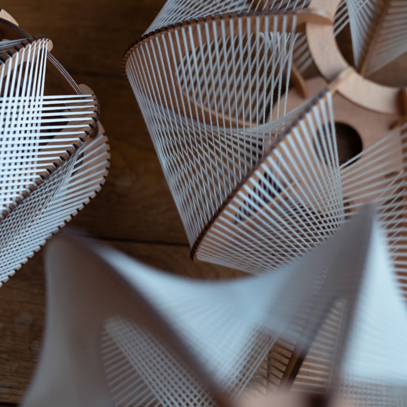 LAFABLIGHTは、木製のフレームとテンションを調整しながら丁寧に編み上げられた糸によってつくられています。製作はフランス国内の家具工房で、すべての工程が手作業。使用される木材も、ナラ、ポプラ、ブナなど、パリから西に広がる森の木々を現地で製材したものです。素材の美しさと職人の技が織りなすその造形は、まさに”Made in France”の精神を体現しています。