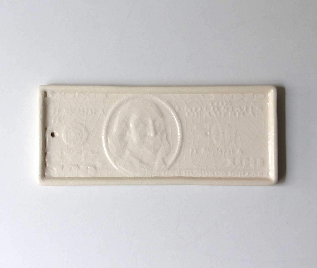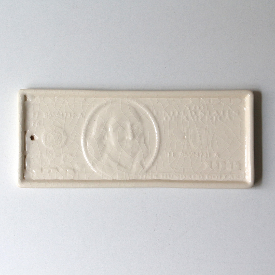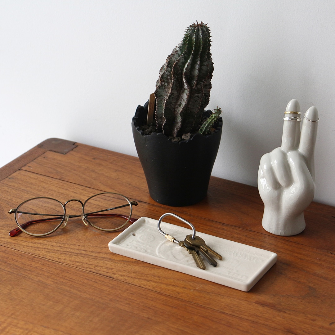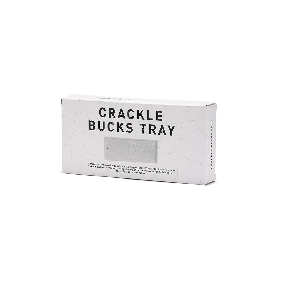 100ドル札のデザインをモチーフに、貫入仕上げで表現したトレイ。 グラフィカルな印象を持ちながらも、陶器ならではの温もりを感じさせ、オブジェのような存在感が空間にアクセントを与えます。商品名の“bucks”は、アメリカでドルを意味する俗語であり、100ドル札のモチーフとリンクしたネーミングです。