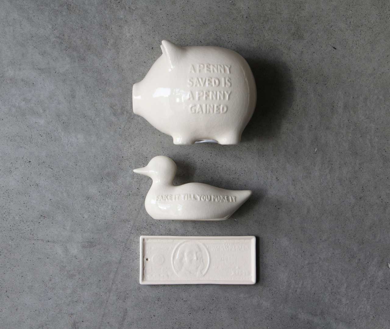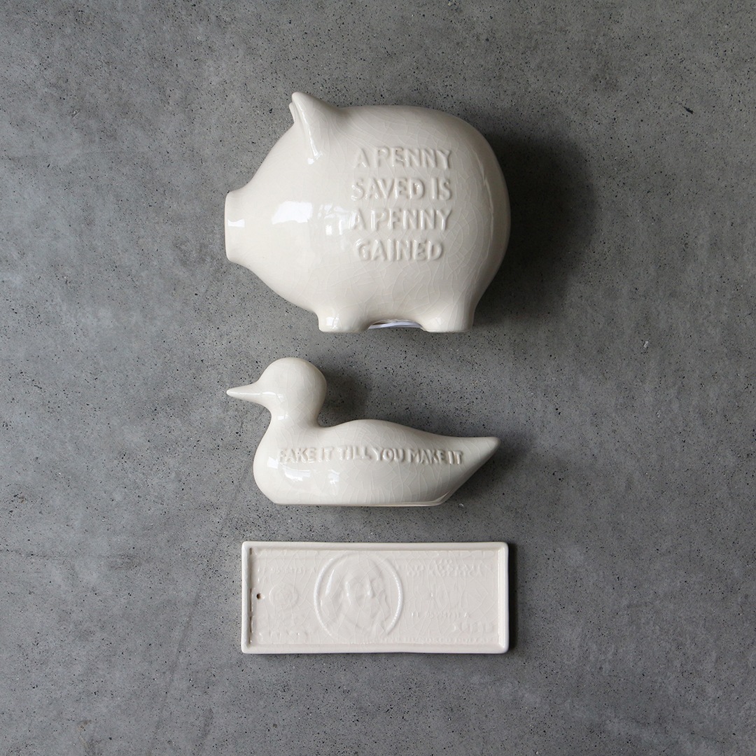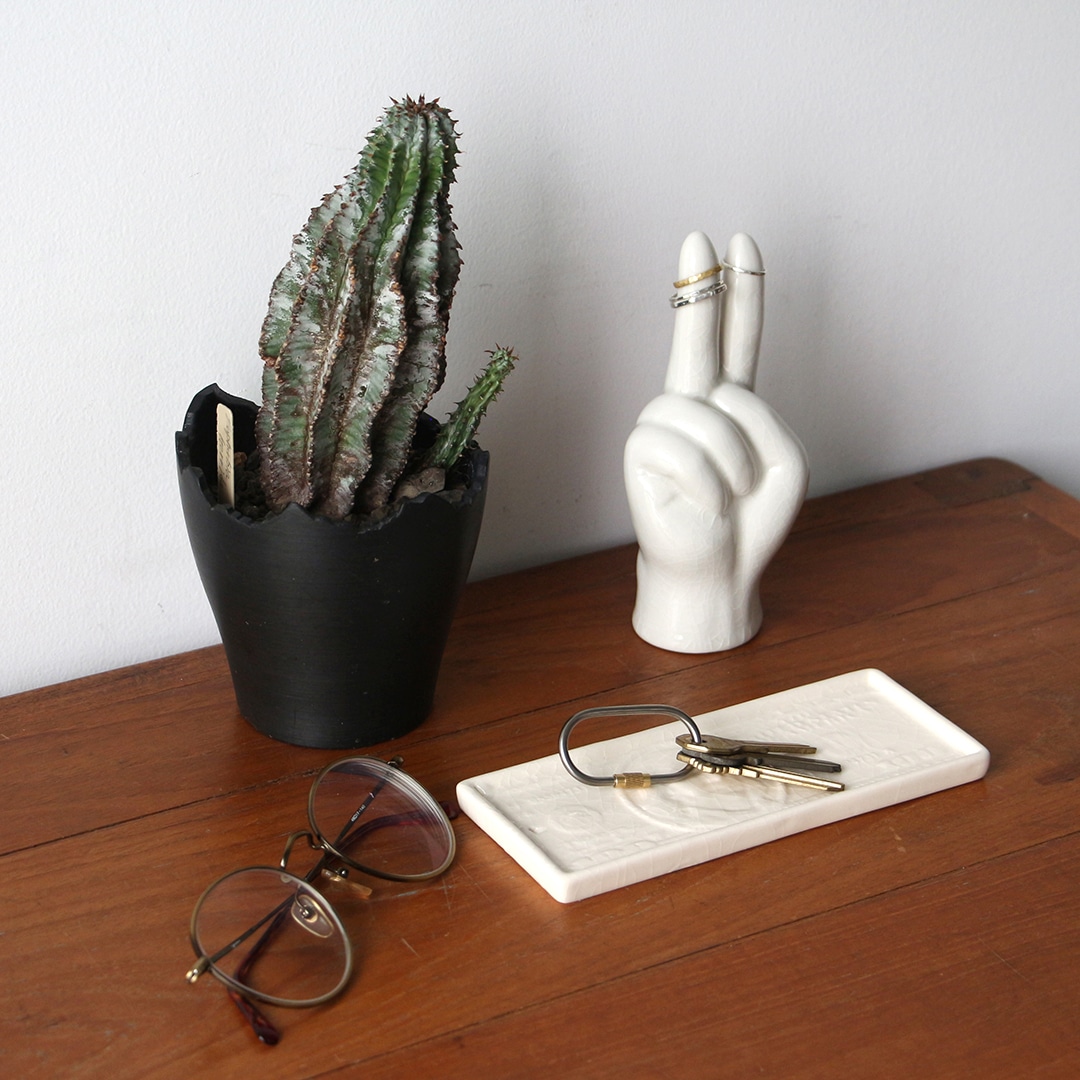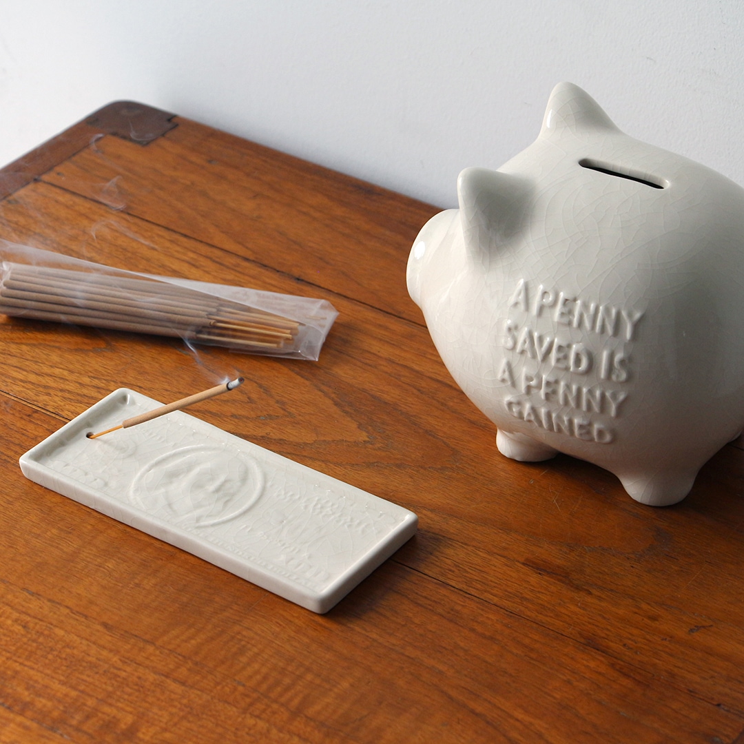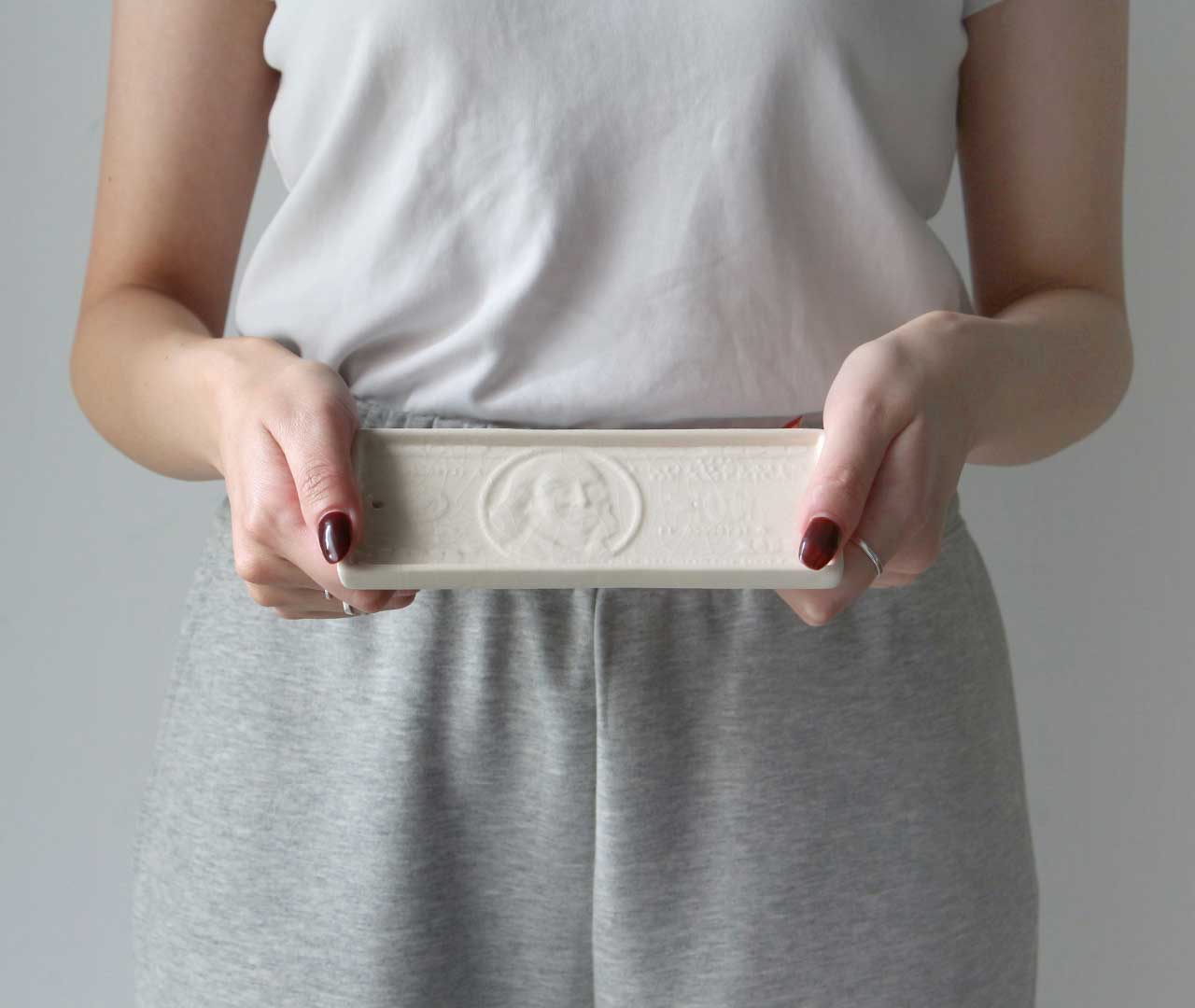 100ドル札のデザインをモチーフに、貫入仕上げで表現したトレイ。 グラフィカルな印象を持ちながらも、陶器ならではの温もりを感じさせ、オブジェのような存在感が空間にアクセントを与えます。商品名の“bucks”は、アメリカでドルを意味する俗語であり、100ドル札のモチーフとリンクしたネーミングです。