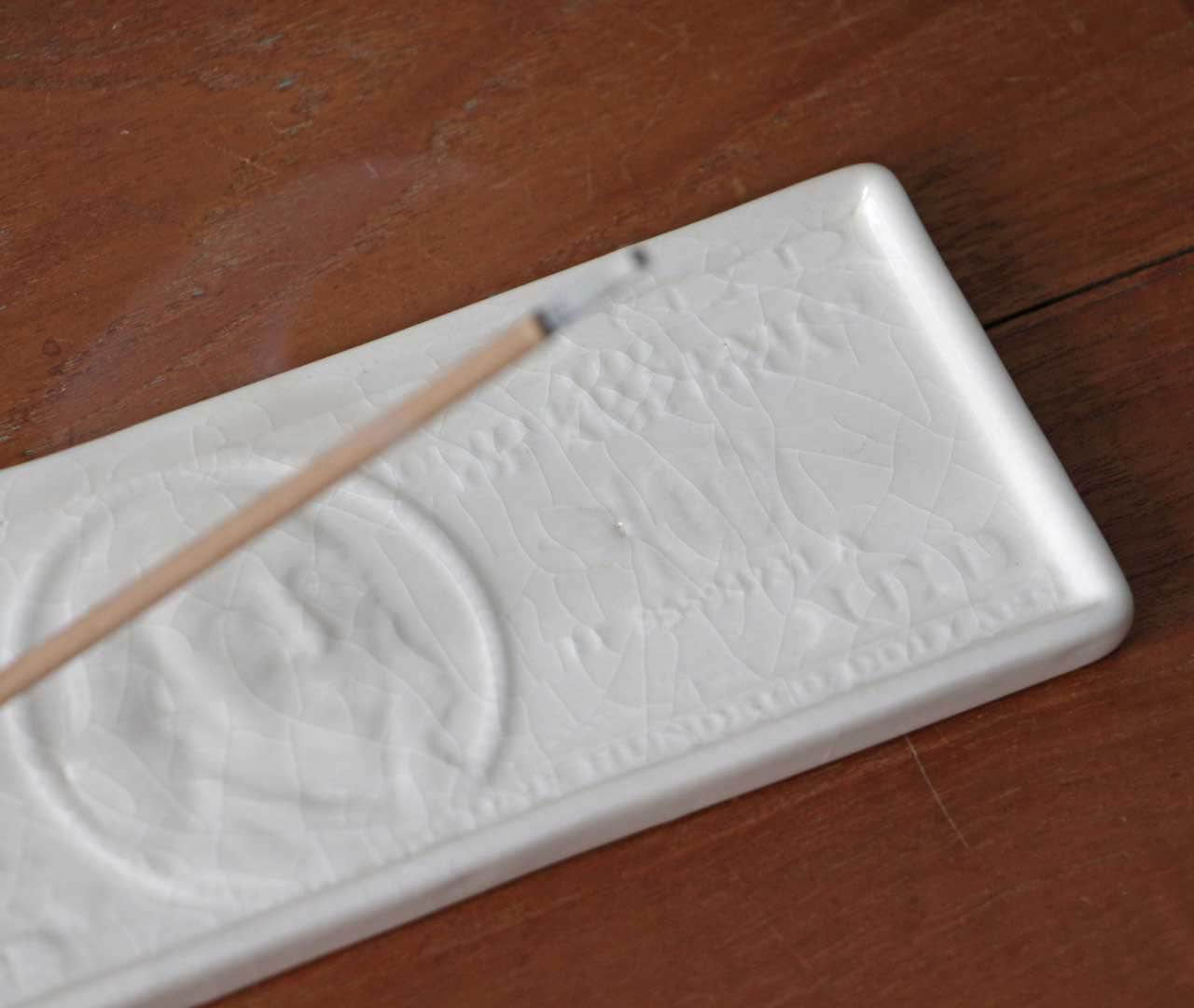 サイドのホール部分にインセンスを差し込めば、インセンススタンドとしても使用可能。香りが立ち上る様子とともに、貫入の表情が静かに映え、視覚的にも楽しめるデザインです。