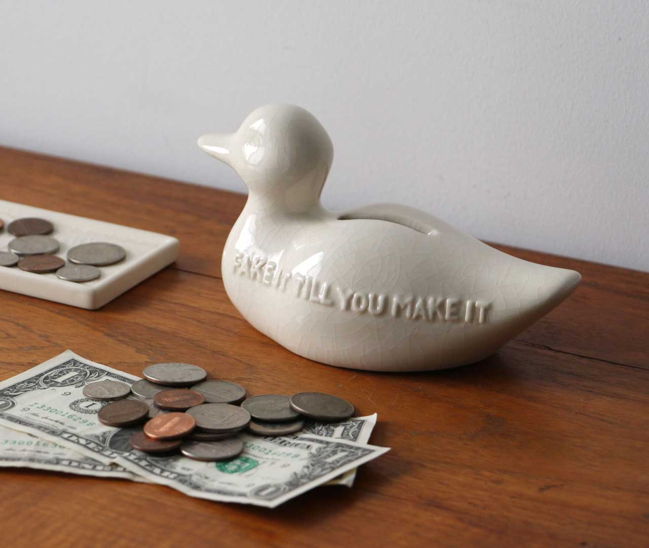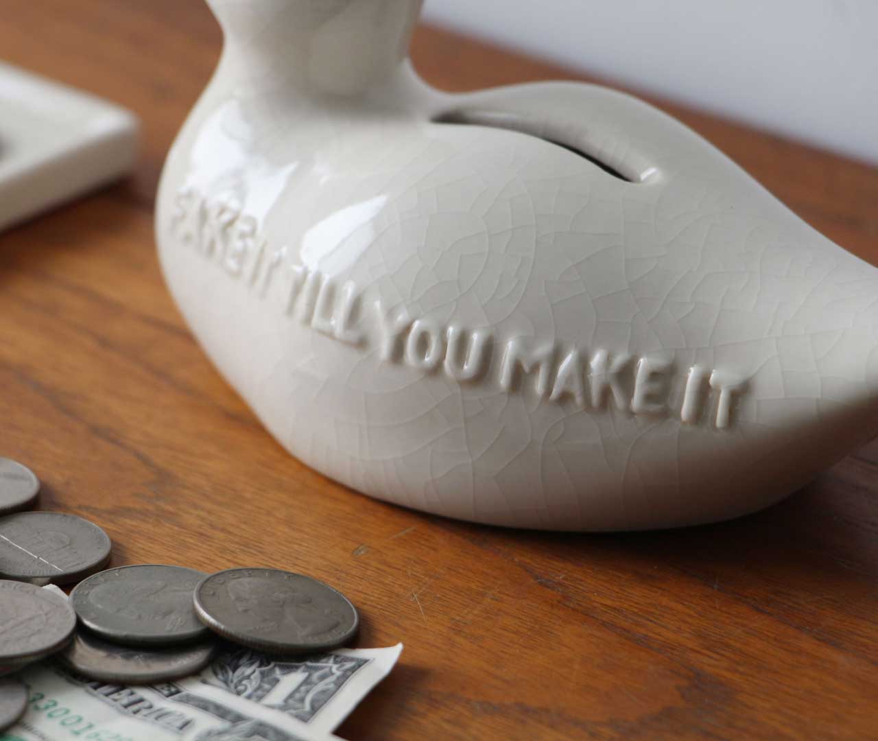 ボディには“なりきっているうちに本物になる”という意味を持つ「FAKE IT TILL YOU MAKE IT」のメッセージを刻印。コインを落とすと陶器ならではの澄んだ音が響き、貯金の時間を心地よく演出します。底面にはラバー製の蓋付きで、実用性も備えたアイテムです。