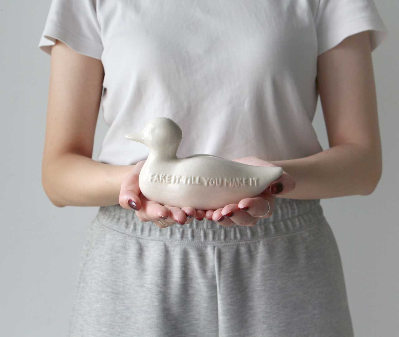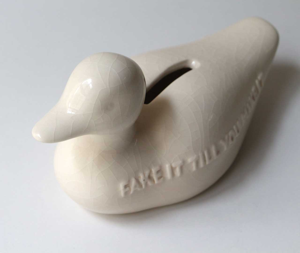Decoyは、鴨をモチーフとした陶器製の貯金箱。 一見すると本物の鴨のようでありながら、実は囮として生まれた「デコイ(Decoy)」という存在をモチーフにしています。かつて狩猟の道具だったこの造形を、貫入仕上げの陶器で表現することで、静かな存在感と奥行きのある表情を与えました。