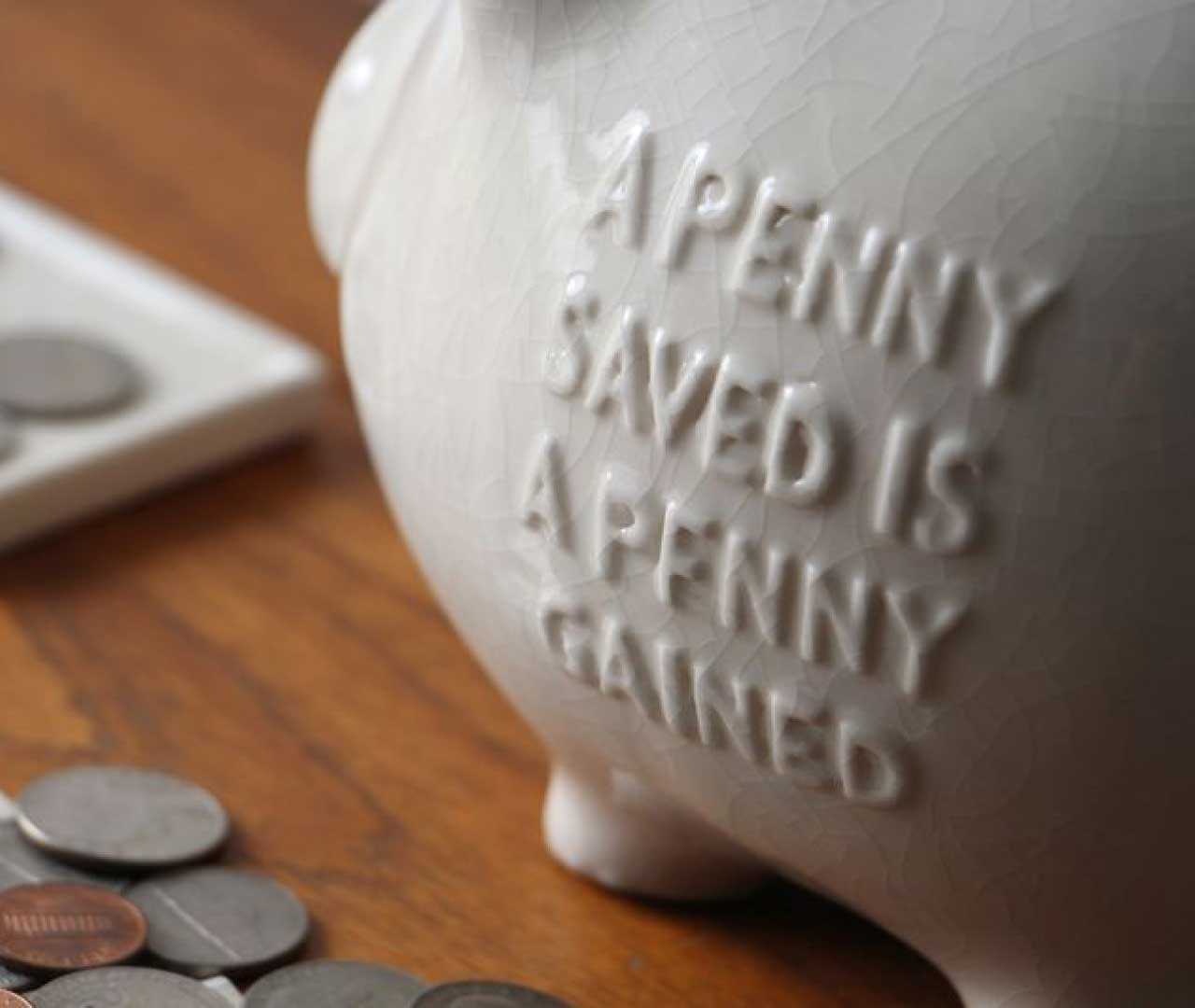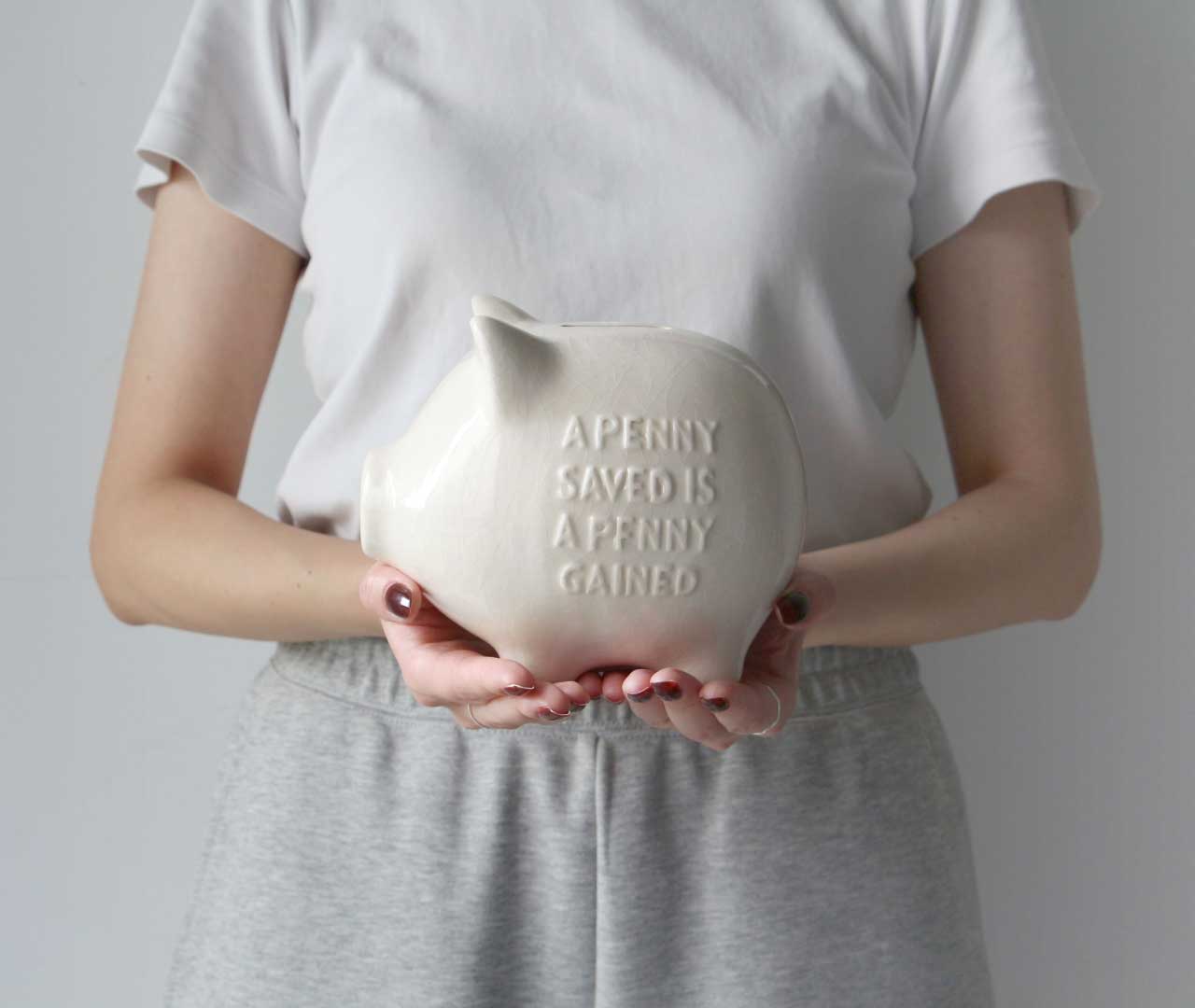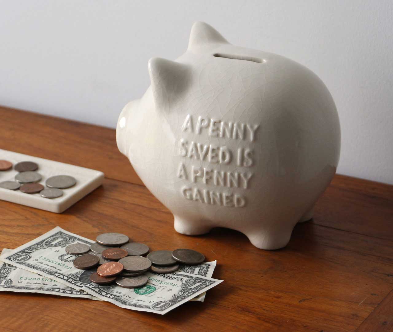ボディにはベンジャミン・フランクリンの言葉として知られる"A PENNY SAVED IS A PENNY GAINED"(1ペニーの節約は1ペニーの儲け)をエンボスで表現。時代を超えて受け継がれるメッセージを宿したピギーバンクです。