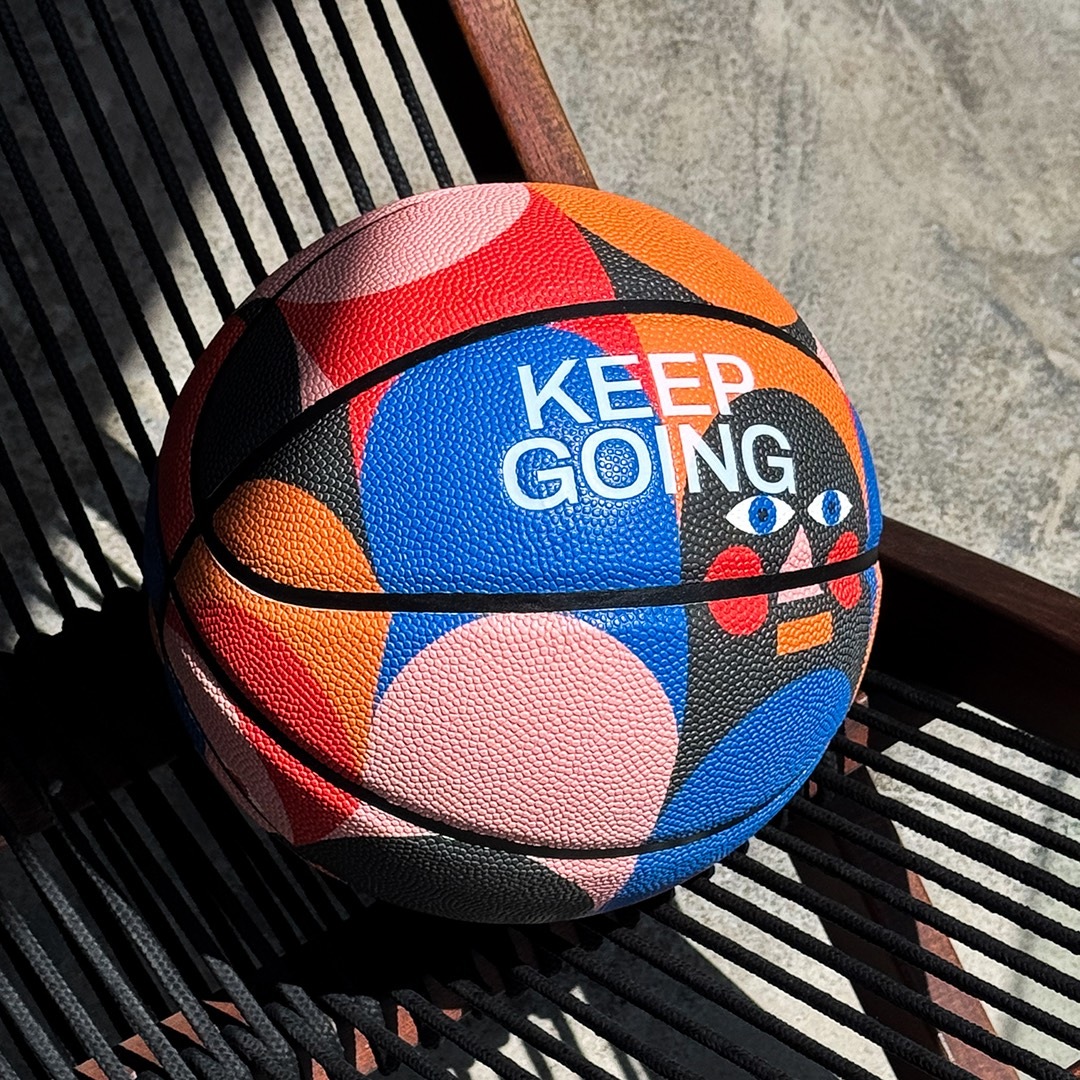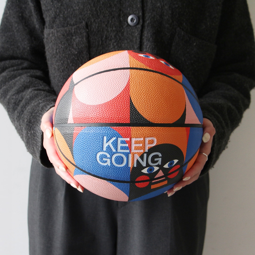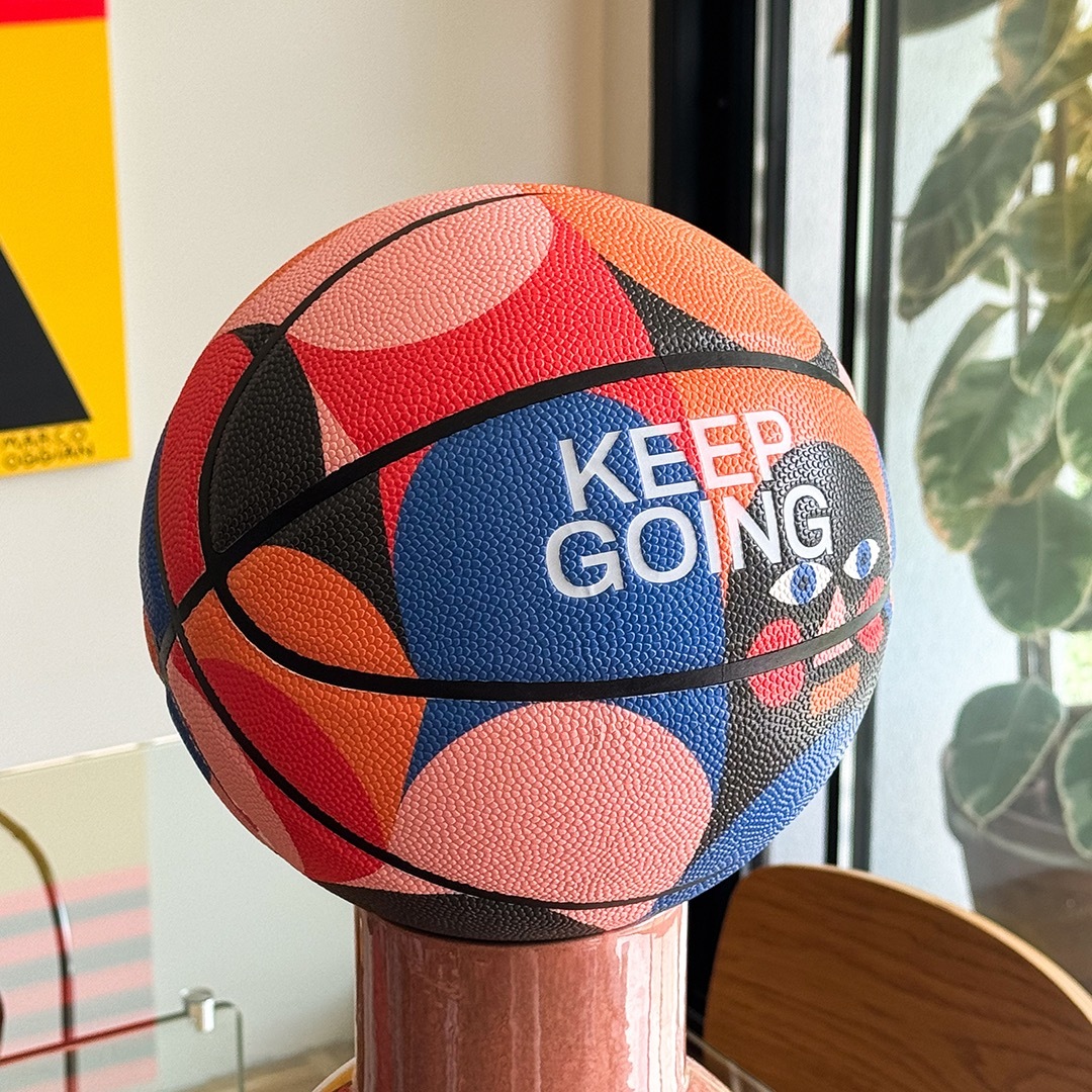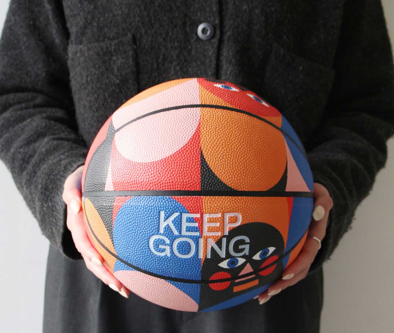 ボールには「DON'T WORRY, KEEP GOING」というメッセージを刻み、スポーツアイテムとしての機能性と、空間に強い印象を残すデザイン性を兼ね備えています。