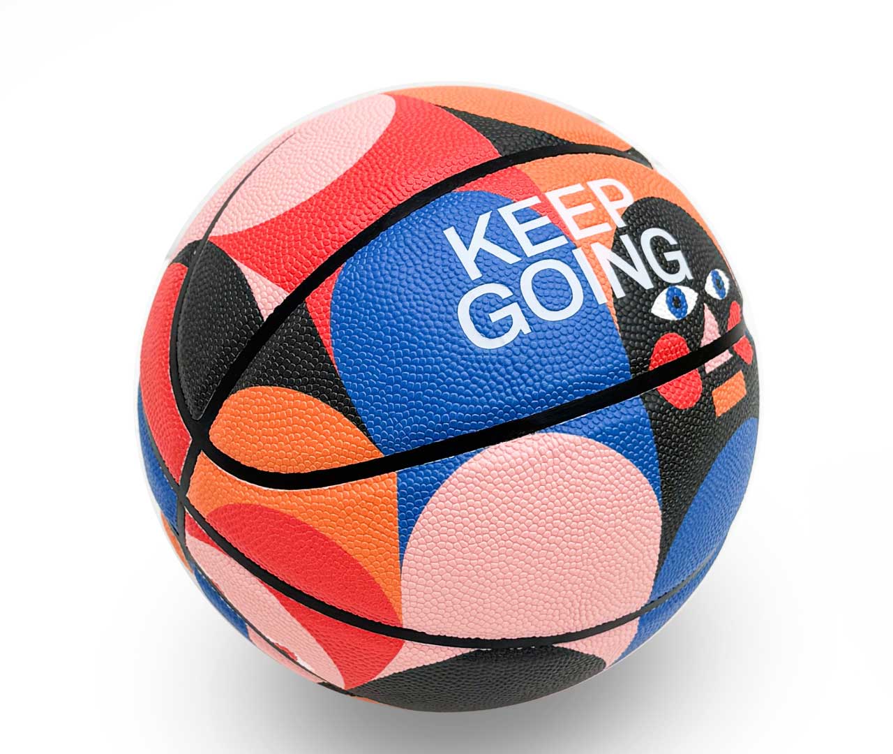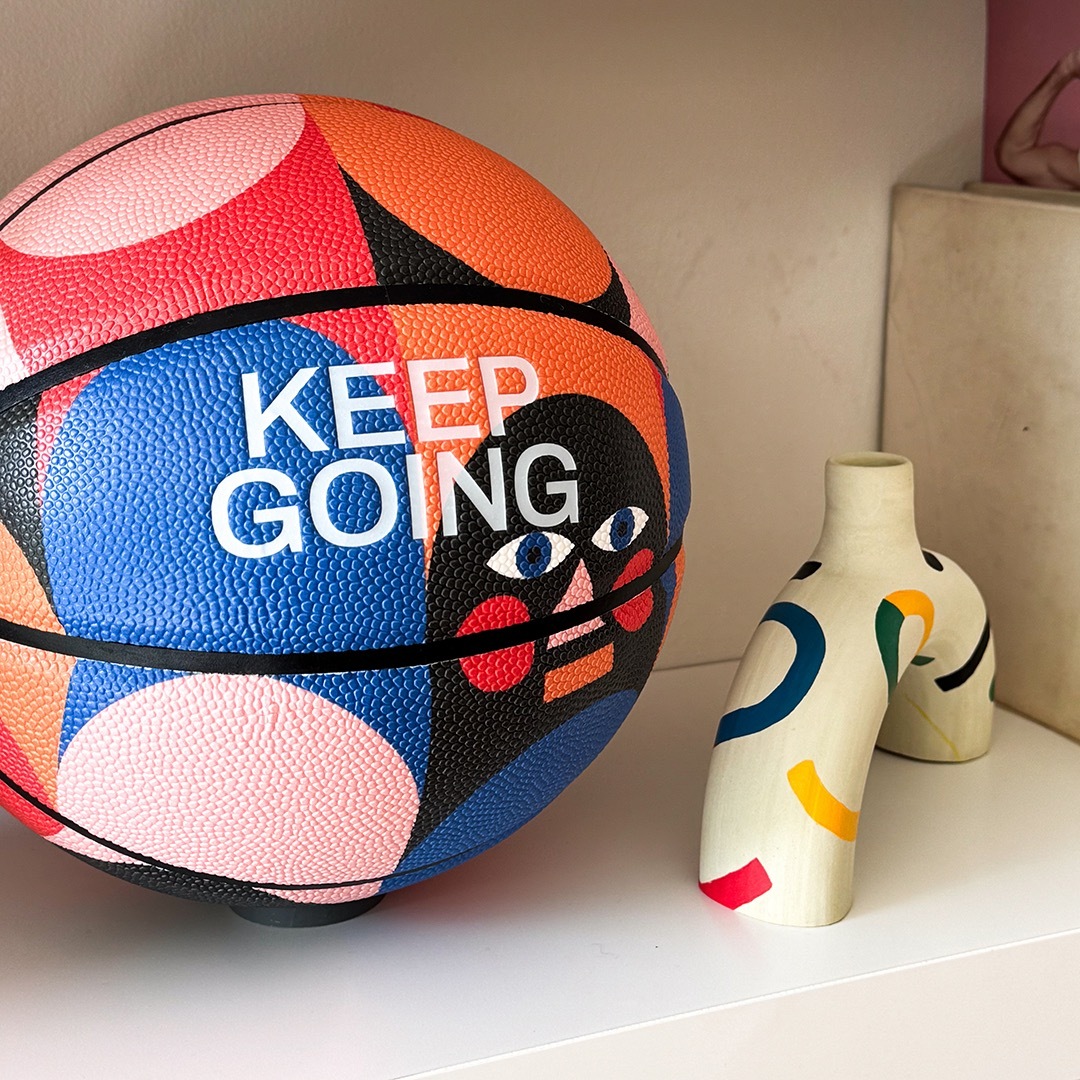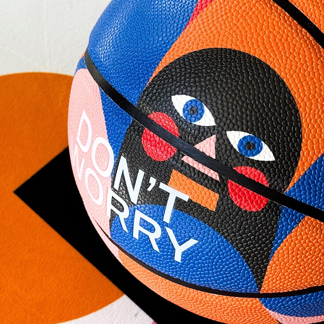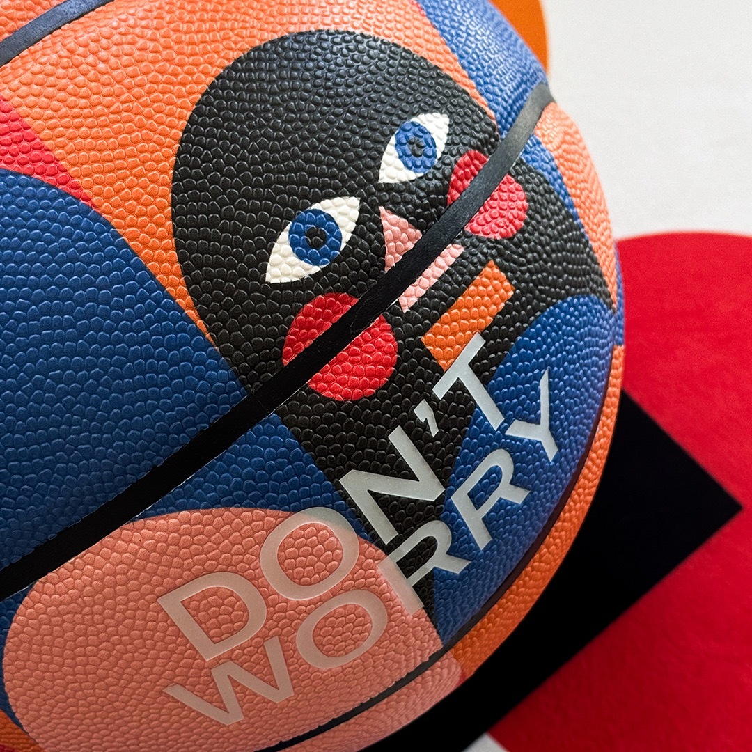 ボールには「DON'T WORRY, KEEP GOING」というメッセージを刻み、スポーツアイテムとしての機能性と、空間に強い印象を残すデザイン性を兼ね備えています。