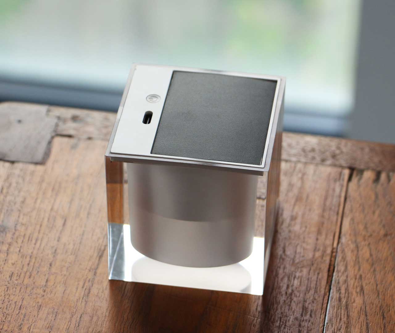 本体底面にはソーラーパネルとON / OFFのメインスイッチ、USB Type-Cポートを設置。機能性を備えながらも、シンプルで洗練されたフォルムを損なわないデザインに仕上げています。空間に自然と溶け込み、使う場所を選びません。