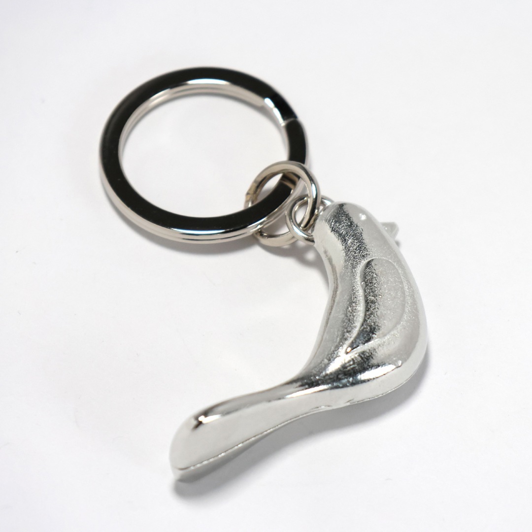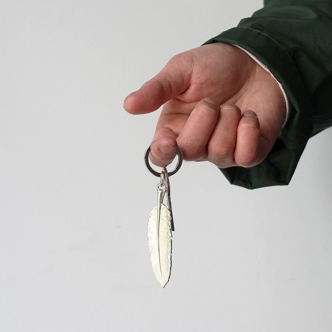キーリングには、一般的なメタルよりも柔らかく重量感のあるピューター(錫)素材を使用。メッキ加工を施さず、素材本来の風合いを活かしているため、使い込むほどに深みのある表情へと変化していきます。ハンドメイドならではの柔らかなフォルムと確かな重みは、手に取るたびに安心感をもたらします。