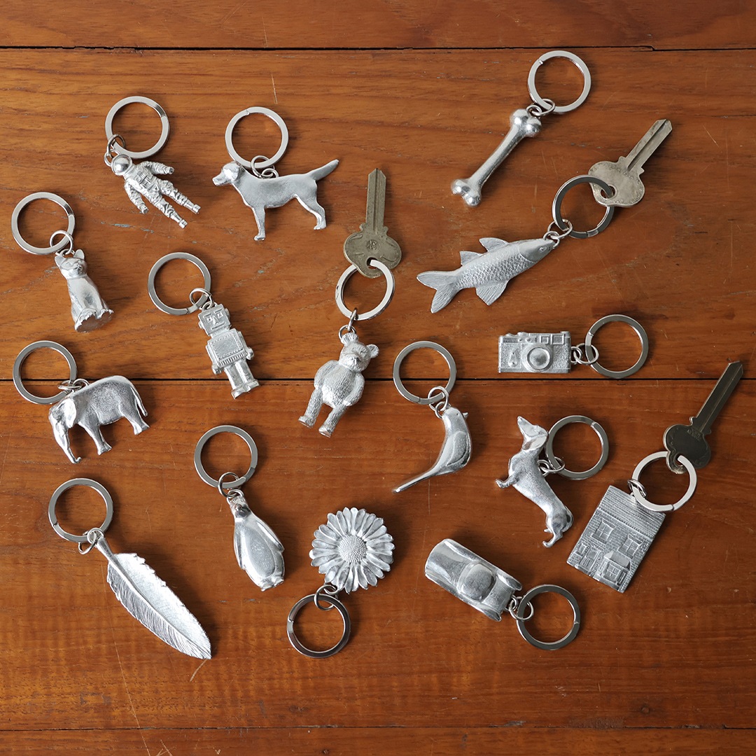 犬や猫、宇宙飛行士など、多彩なモチーフを展開。カラビナと組み合わせることで、鍵束だけでなくバッグチャームとしても使える自由度の高いキーリングです。大量生産の小物では物足りない人や、長く使えるものを贈りたい場面にも適したアイテムです。