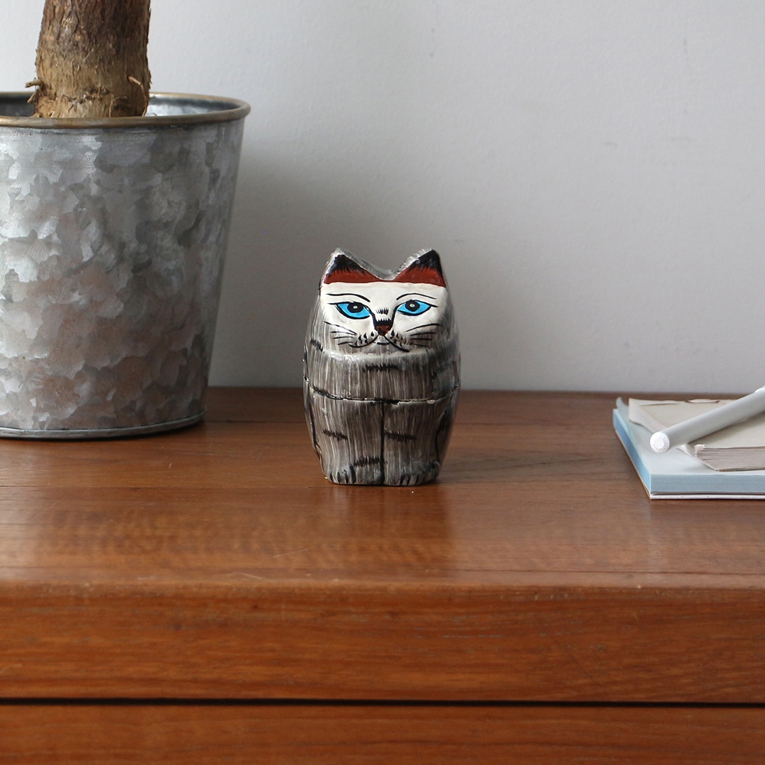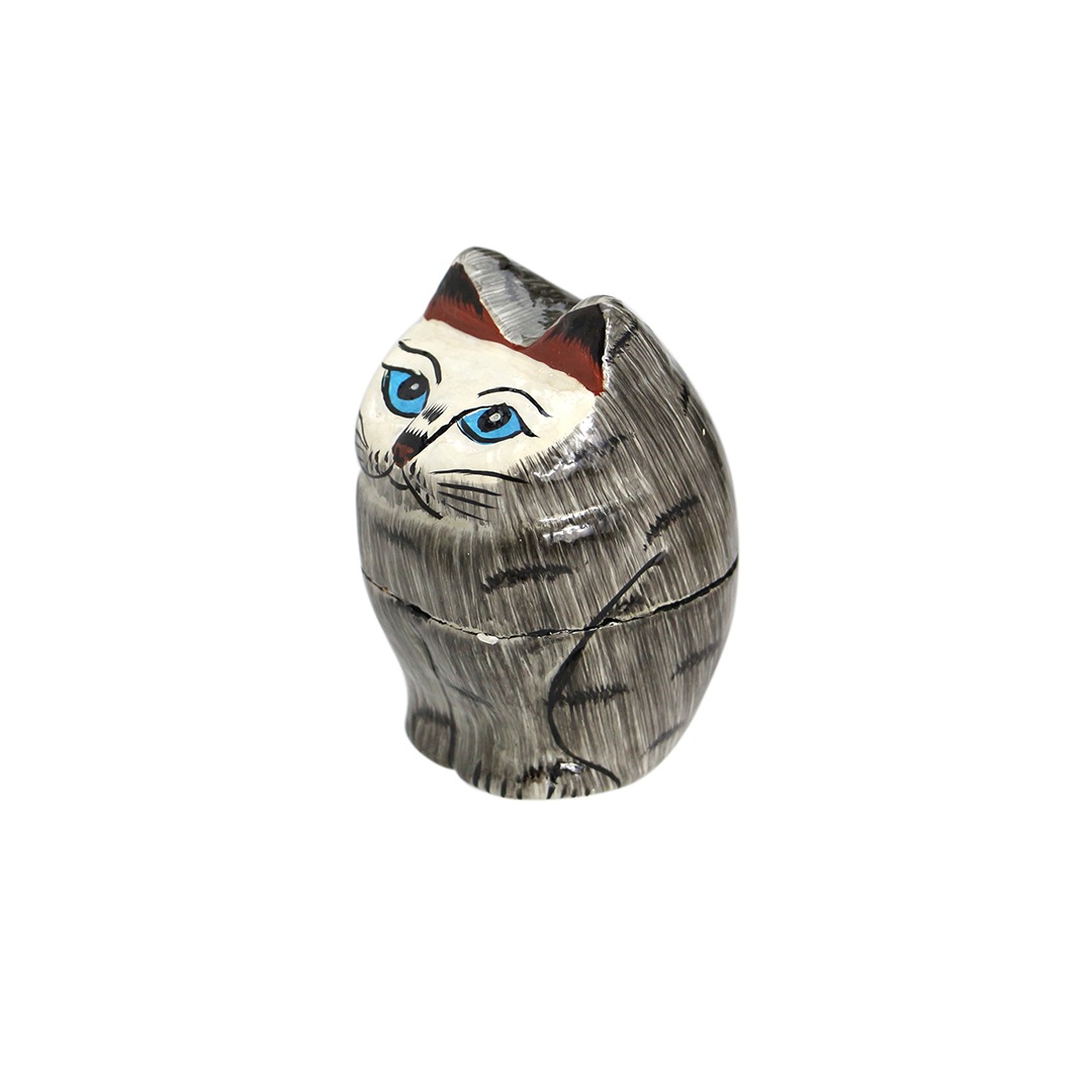 インドの職人が一つひとつ丁寧に手描きで仕上げた、猫モチーフのパピエマシェ小物入れ。