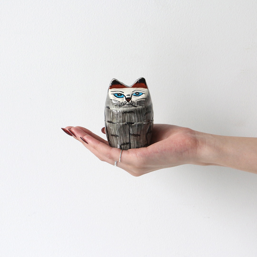 自由きままな表情や愛らしい佇まいはすべて一点もの。手描きならではの色味や柄の違いが、それぞれに個性を与えています。アクセサリーや鍵、デスク周りの小物を収納できる実用性も備え、棚やテーブルに飾るだけで空間にやさしい遊び心を添えてくれます。手仕事のぬくもりを感じながら、自分だけの特別な猫との暮らしをお楽しみください。