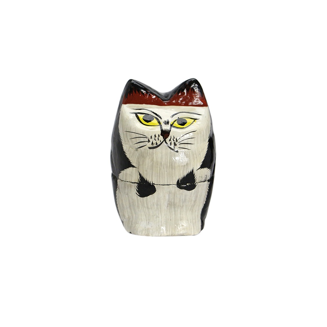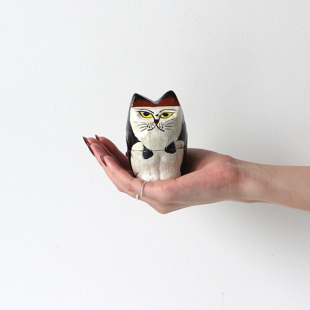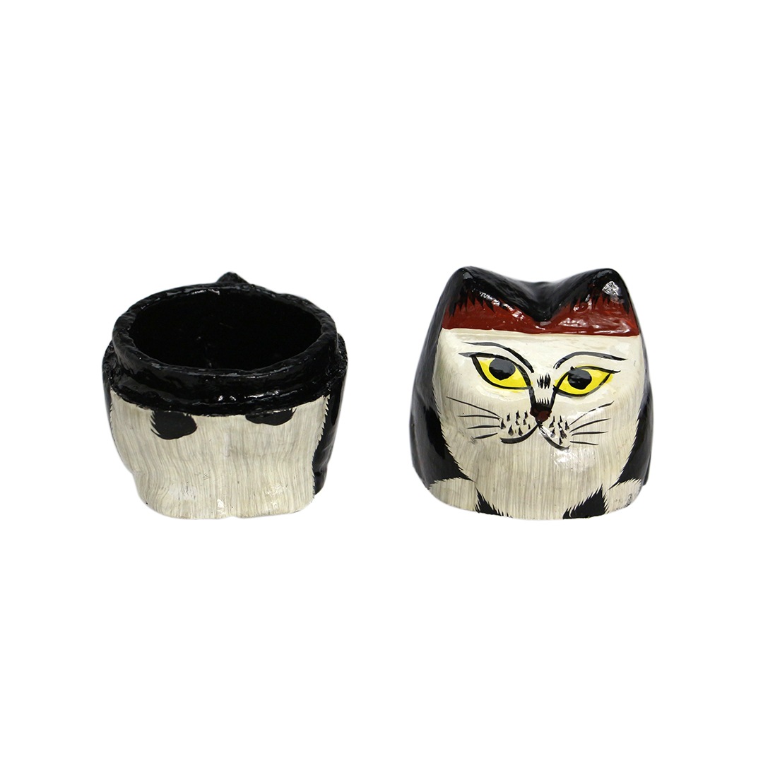 インドの職人が一つひとつ丁寧に手描きで仕上げた、猫モチーフのパピエマシェ小物入れ。