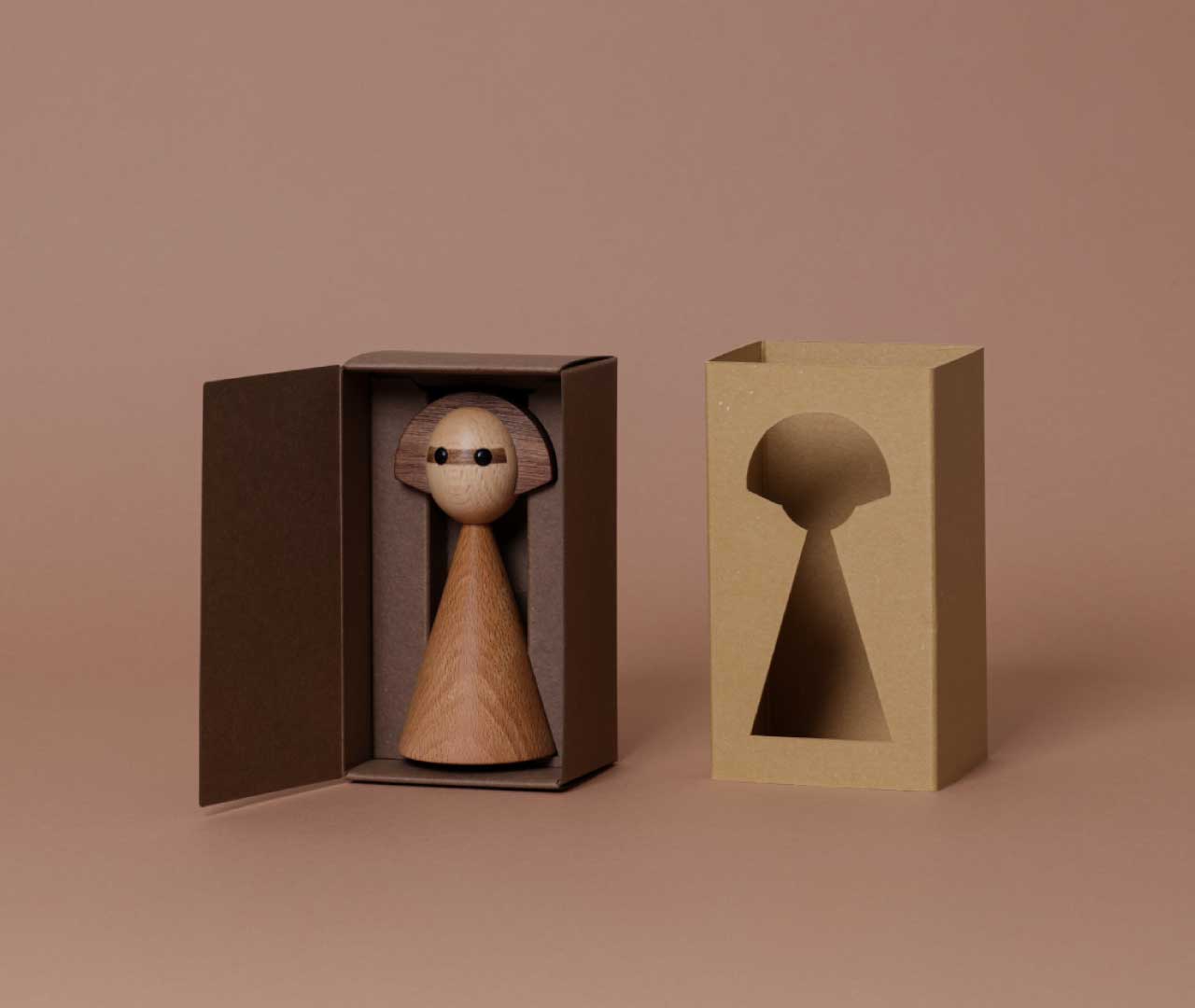 木を思わせる落ち着いた色合いと紙の質感がプロダクトと美しく調和し、箱のままでも飾っておきたくなる仕上がりです。