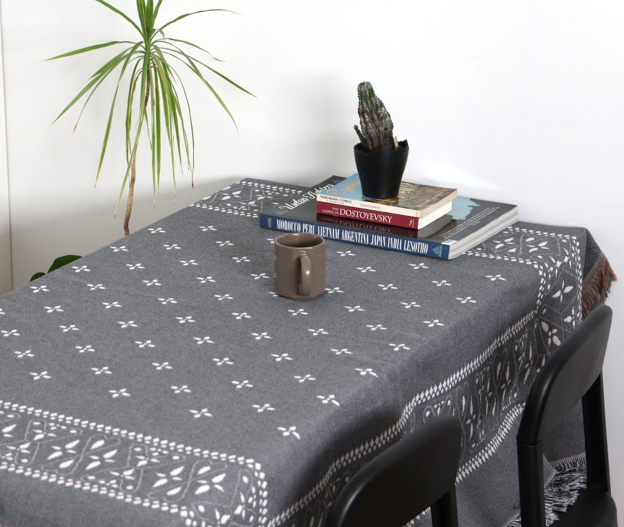 ソファ前に敷いてラグのように使ったり、テーブルクロスとして空間の印象を変えたりと自由にアレンジできます。肩から羽織れば足元まですっぽり覆えるサイズ感で、ブランケットとしても活躍。季節を問わず取り入れやすい、ちょうどいいボリュームです。